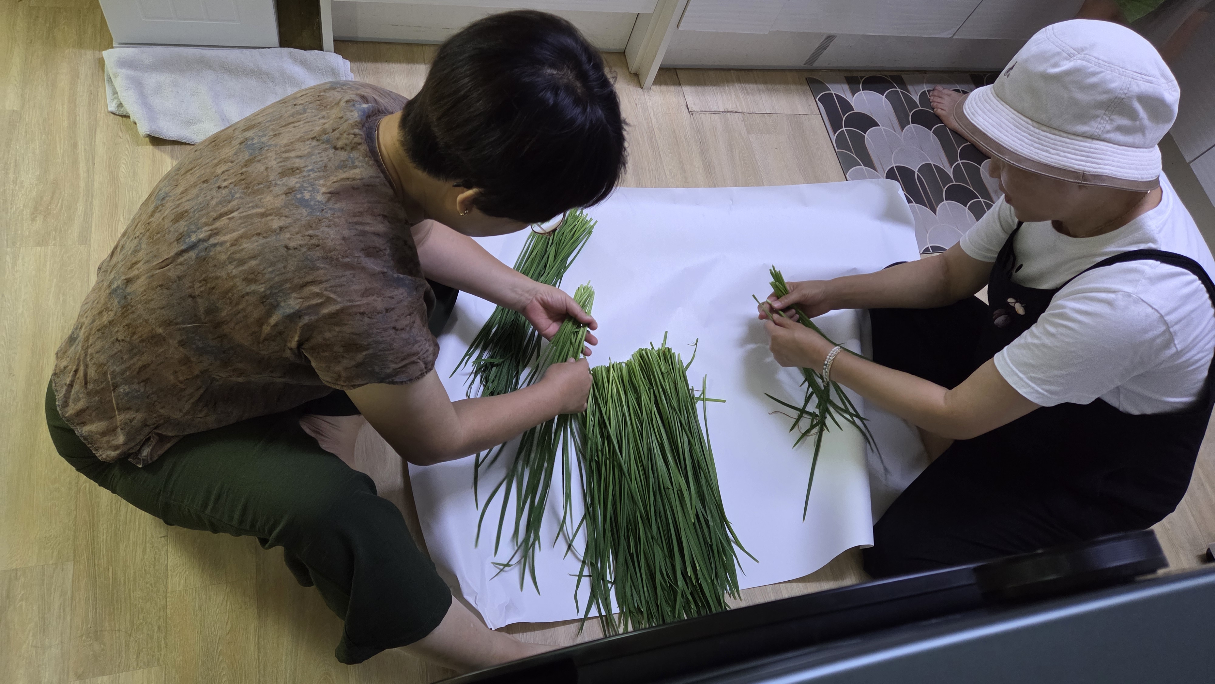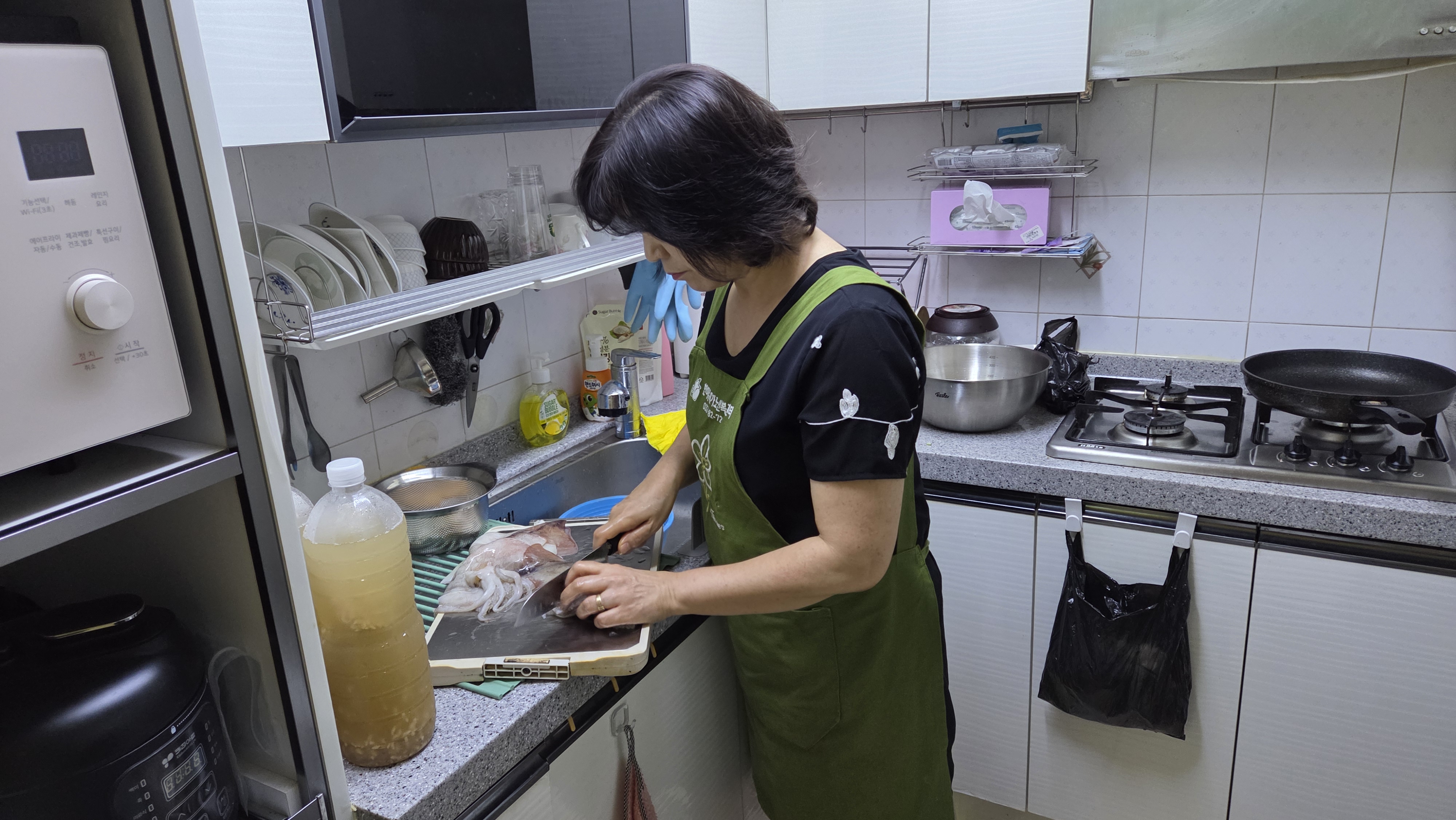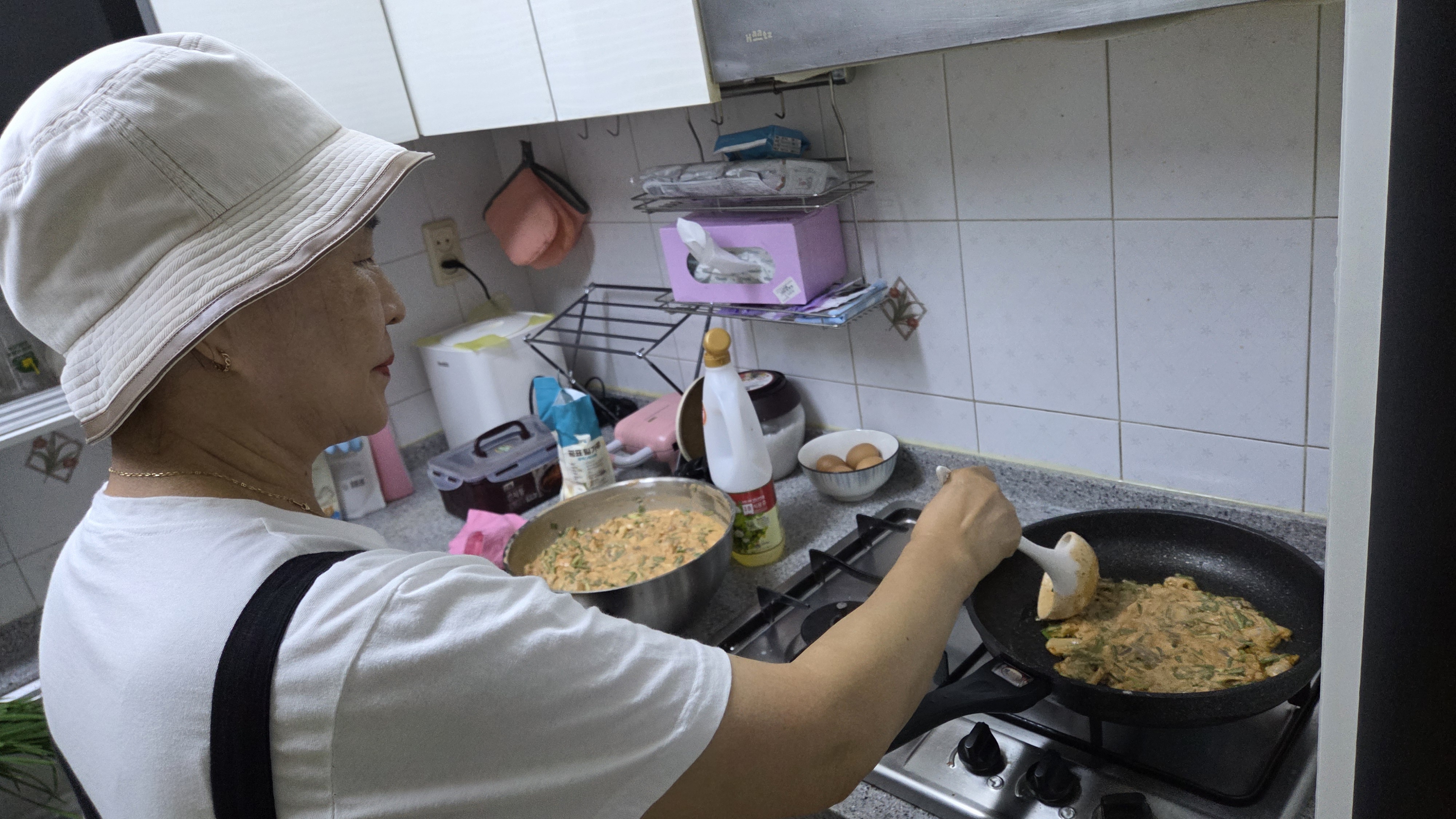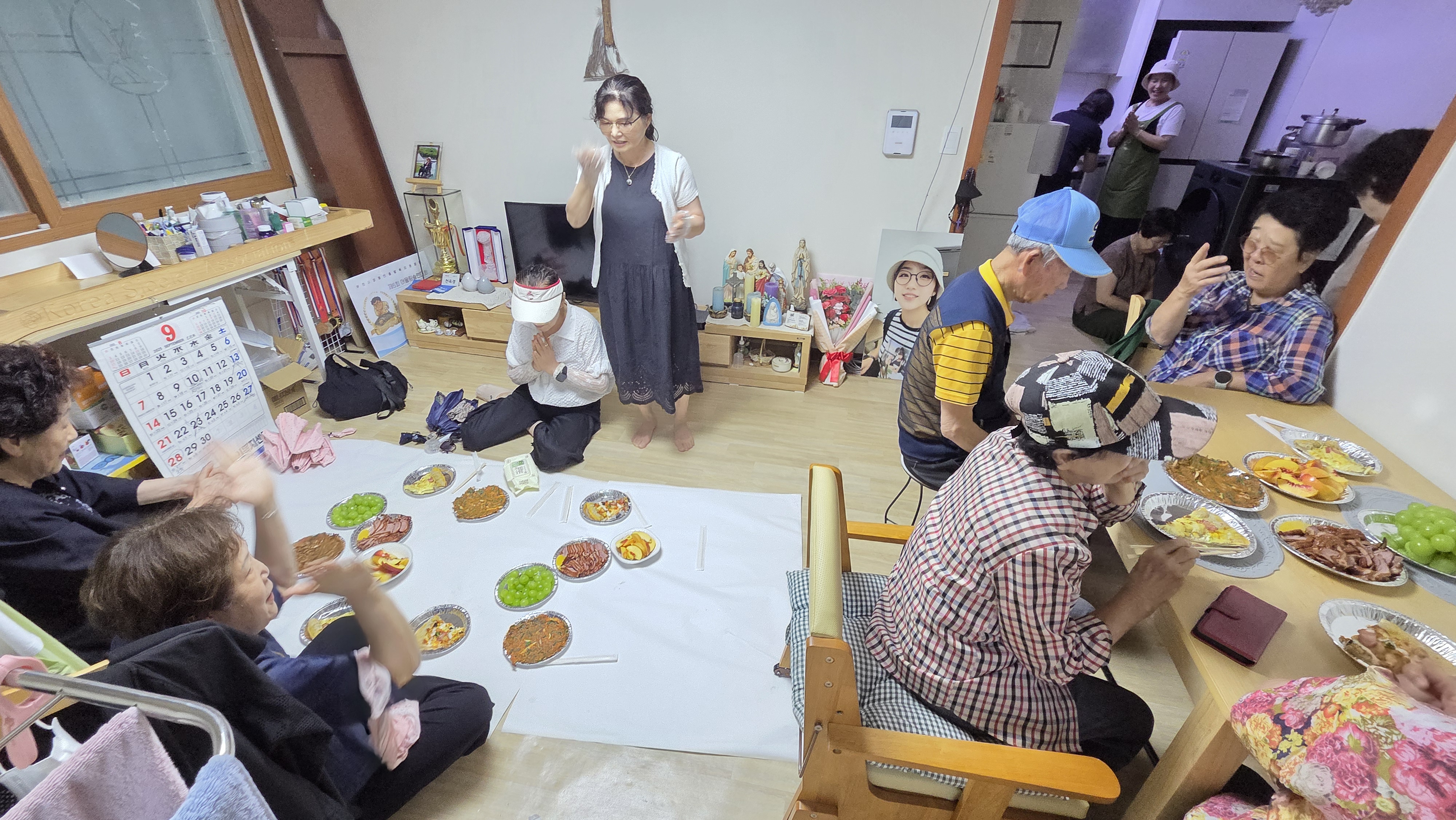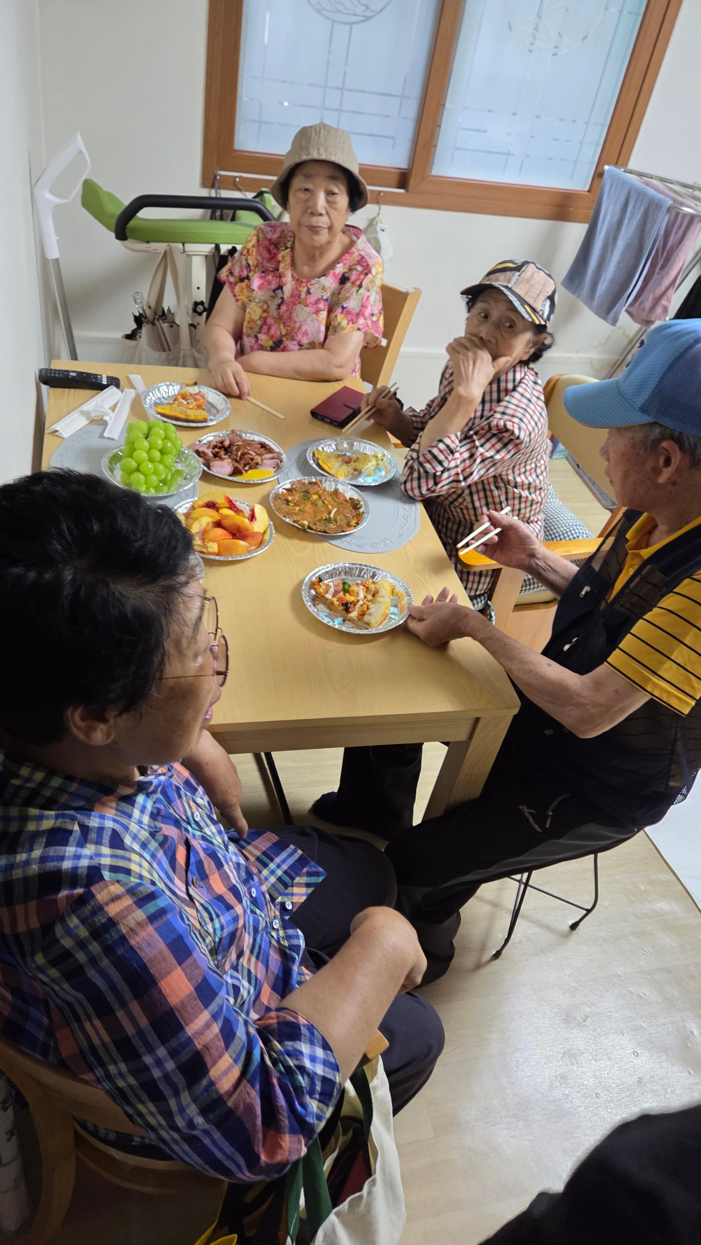어르신들이 오시기 전 송영주 통장님네 김치를 넣어 김치전을 부쳤습니다. 가스레인지 위에는 김치전의 고소한 향이 피어올랐고, 곧이어 피자가 배달되어 등장했습니다. 두 음식은 세대를 아우르는 매개체였습니다. 김치전은 고향의 맛을 떠오르게 하며 어르신들에게는 추억을, 젊은 주민들에게는 전통을 이어받는 감각을 전했습니다. 피자는 세련된 현대적 취향을 반영하며 젊은 세대와의 연결 고리가 되어 주었죠. 이렇게 전통과 현대, 세대와 세대가 공존하는 순간이 펼쳐졌습니다.