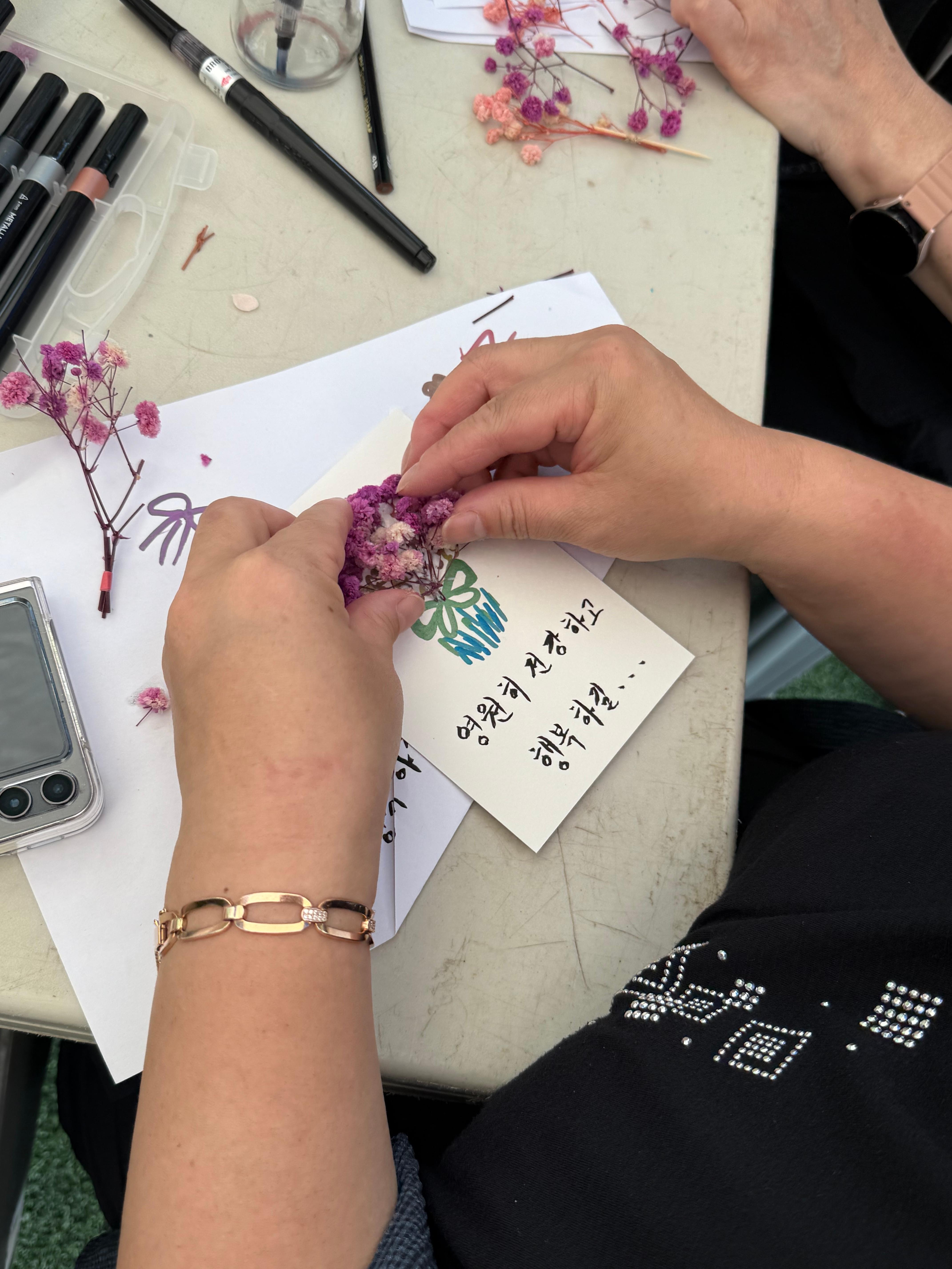 아이들과 어른, 어르신까지 모두 캘리에 집중하고 꽃과 재료들로 자신의 엽서를 꾸미는 모습이 인상적이었습니다.
