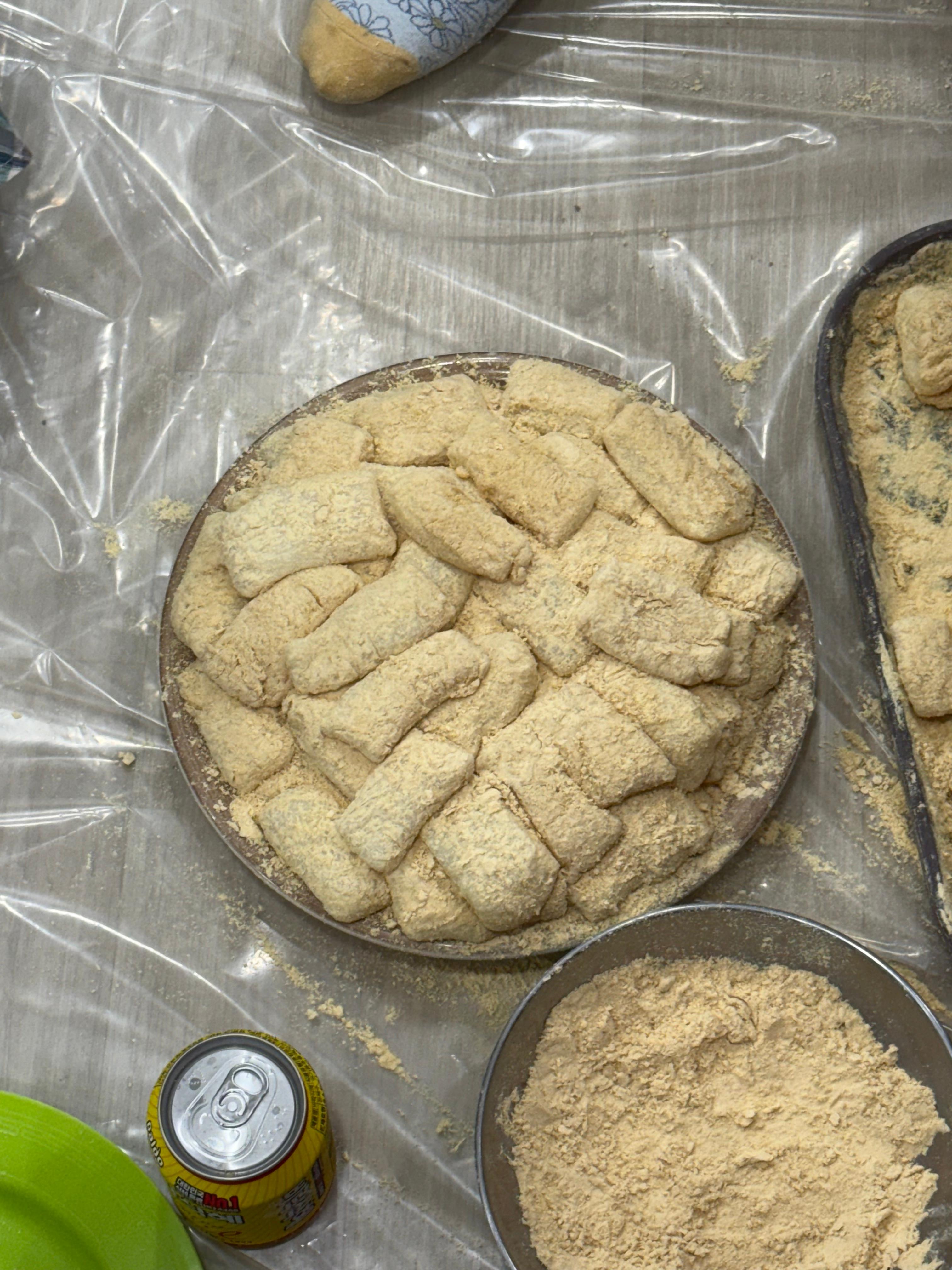 준비된 떡에 고소한 참기름을 바르고 인절미 가루를 묻혀봅니다.