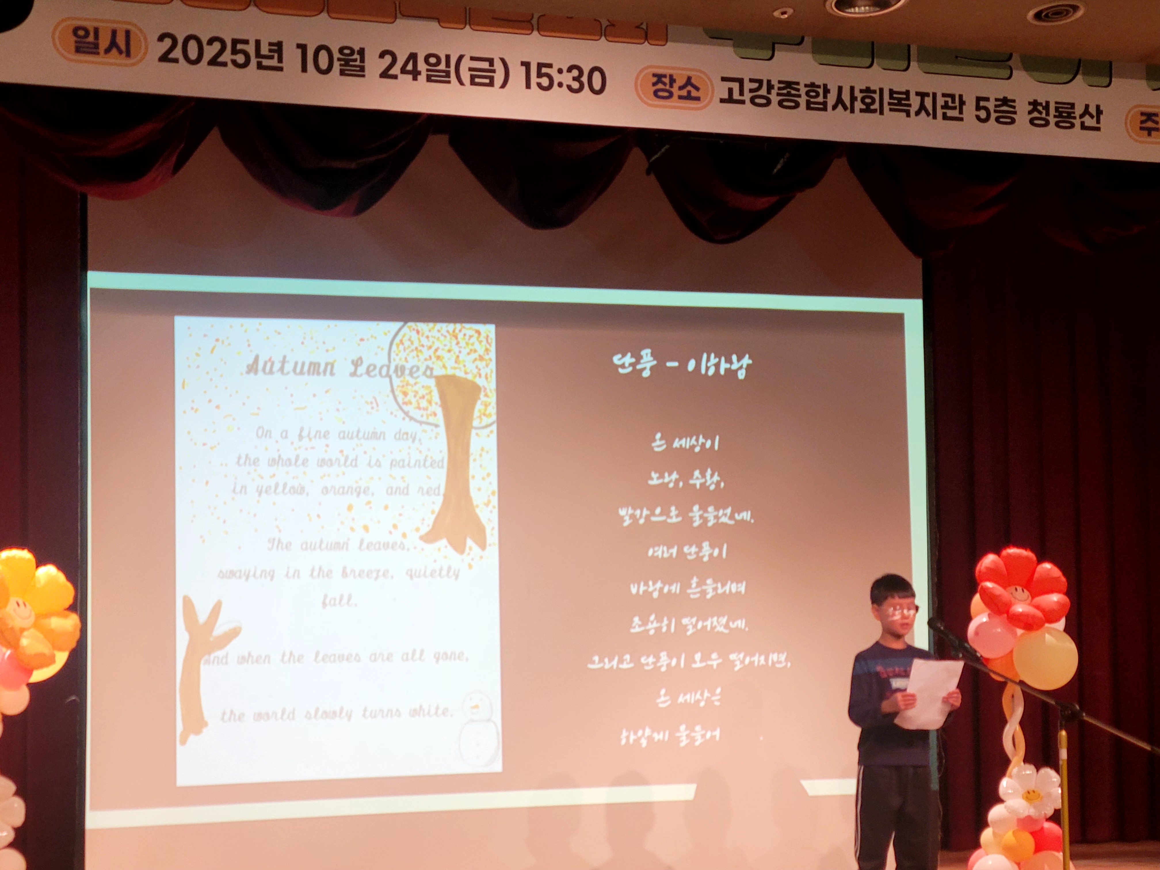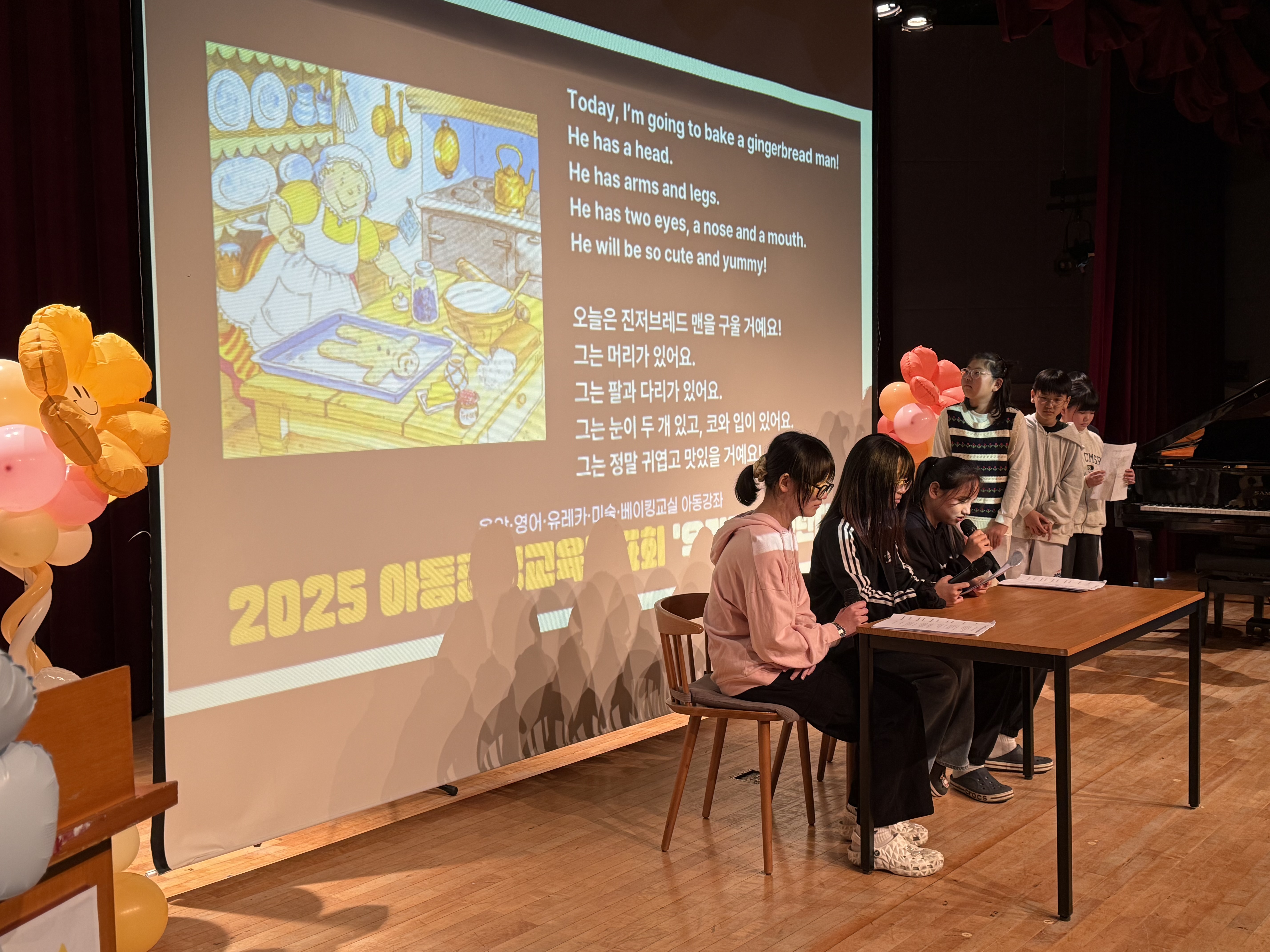 무대에는 영어교실의 동화구연과 영시 발표 7명, 음악교실의 피아노 연주 17명의발표가 이어졌습니다.