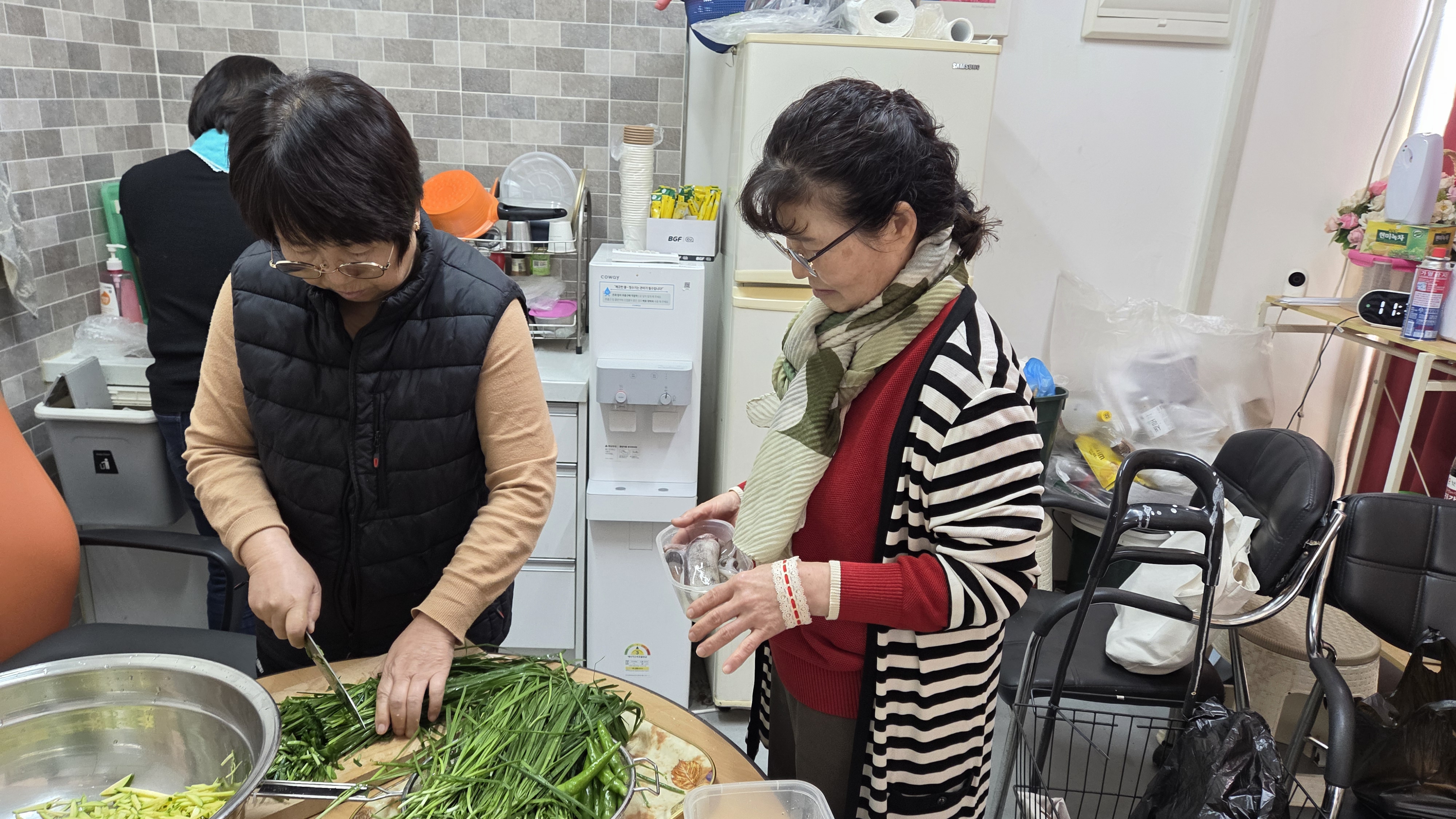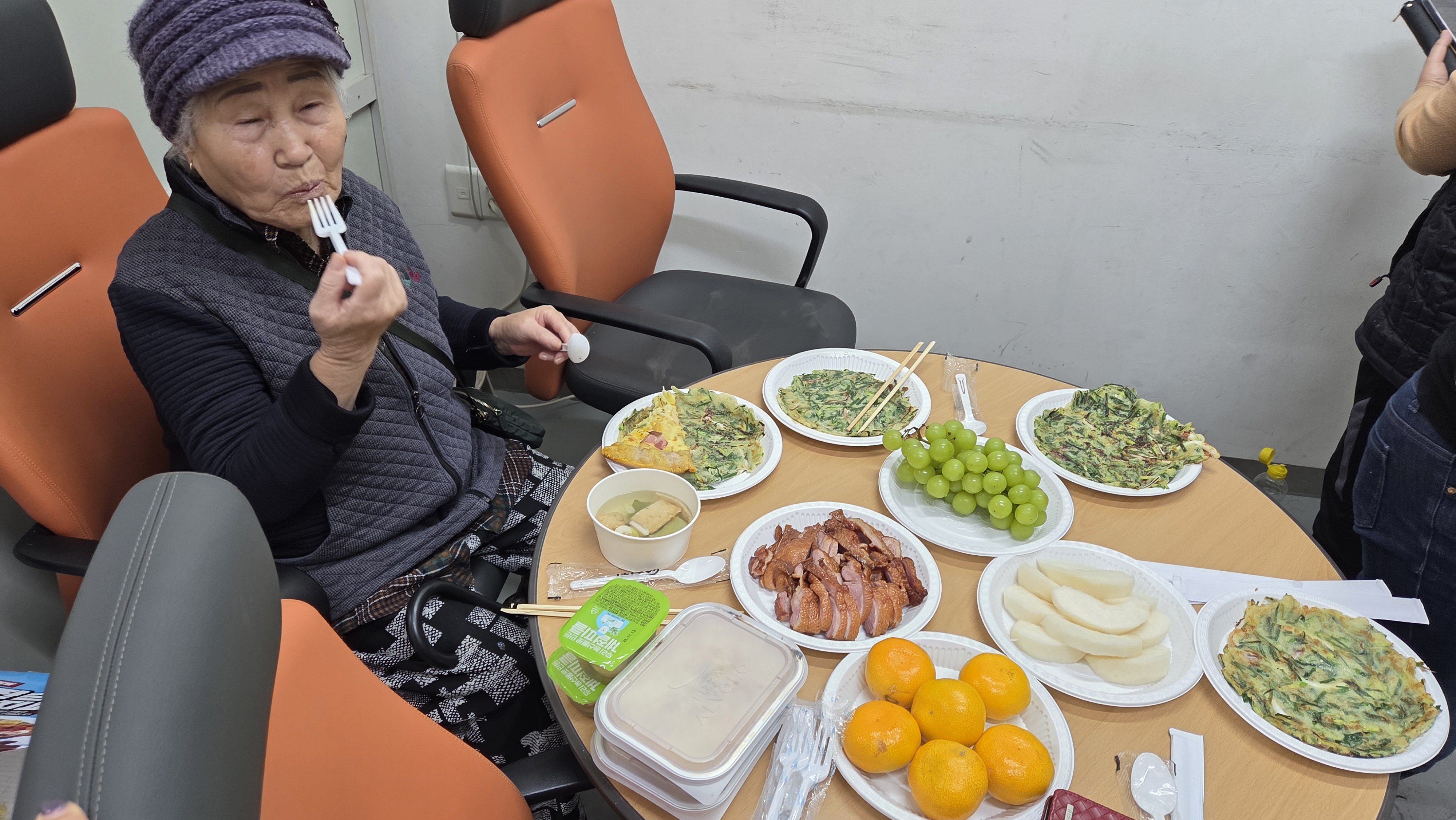 음식이 단순한 식사를 넘어 ‘관계’가 되는 순간이 있습니다. 오늘은 바로 그런 시간이었습니다. 전을 한 장 한 장 부치는 동안 통장님들은 자그마한 이야기들을 꺼내셨고, 어르신들께서는 “요새 어쩌고저쩌고…” 하고 마을 안팎 소식을 전해주셨습니다. 복지사로서 저는 그 이야기들 사이사이에 작은 손길을 더했습니다.