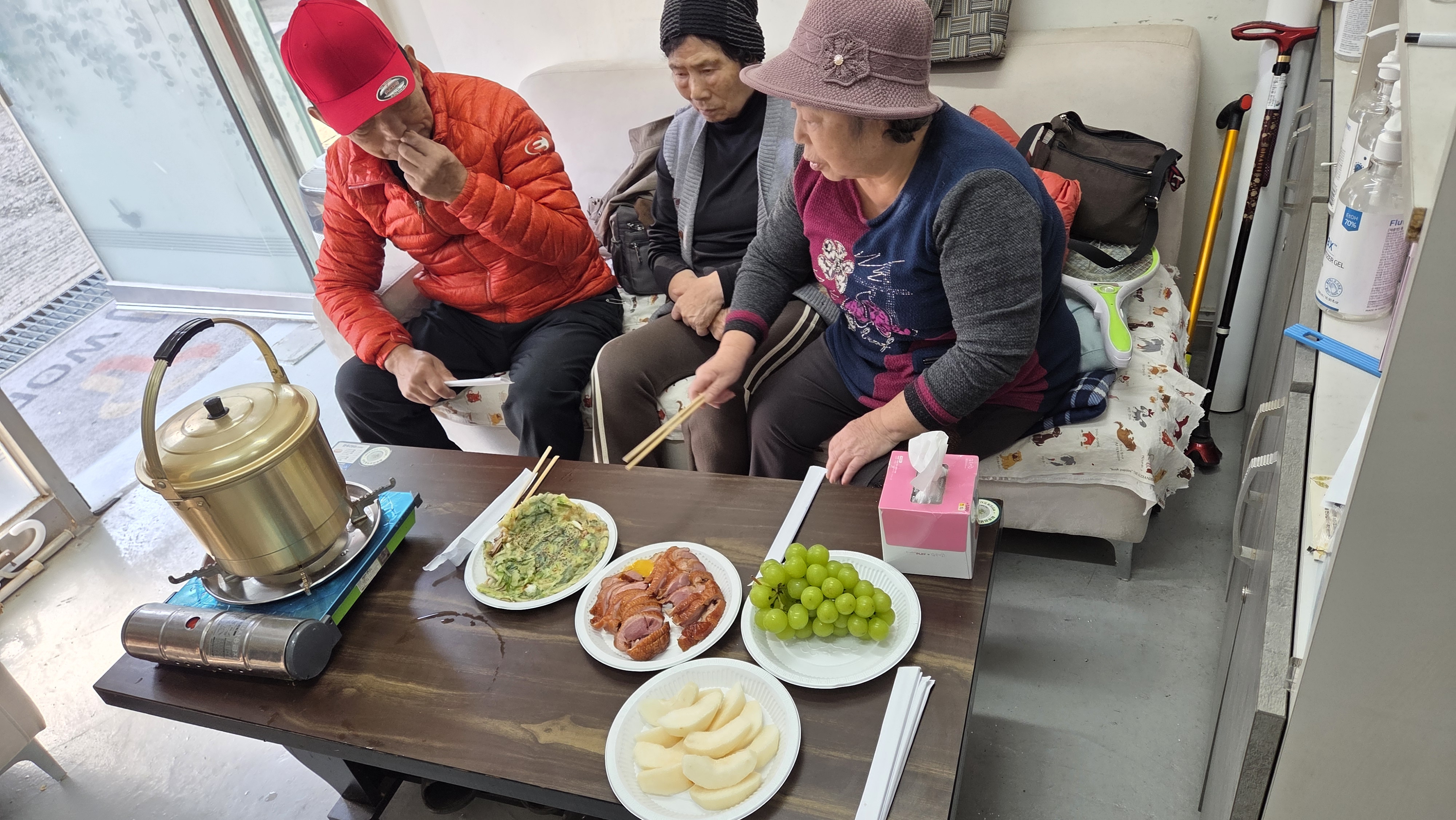 잔치는 먼저 통장님 인사로 시작되었습니다. “오늘 우리가 모여서 함께 먹고, 이야기 나누면 참 좋겠어요.” 통장님 한 분이 그렇게 말씀하시자 어르신들께서 미소로 화답하셨습니다. 그리고 음식이 하나둘 테이블 위에 올려지자 자연스럽게 이야기꽃이 피었습니다. 전이 노릇하게 부쳐지고, 오리훈제가 고소한 냄새를 내며 테이블 중앙에 놓였습니다. 피자는 통장님께서 미리 주문해주셨고, 과일과 어묵탕은 온기가 더해진 채 접시와 냄비에 담겼습니다.