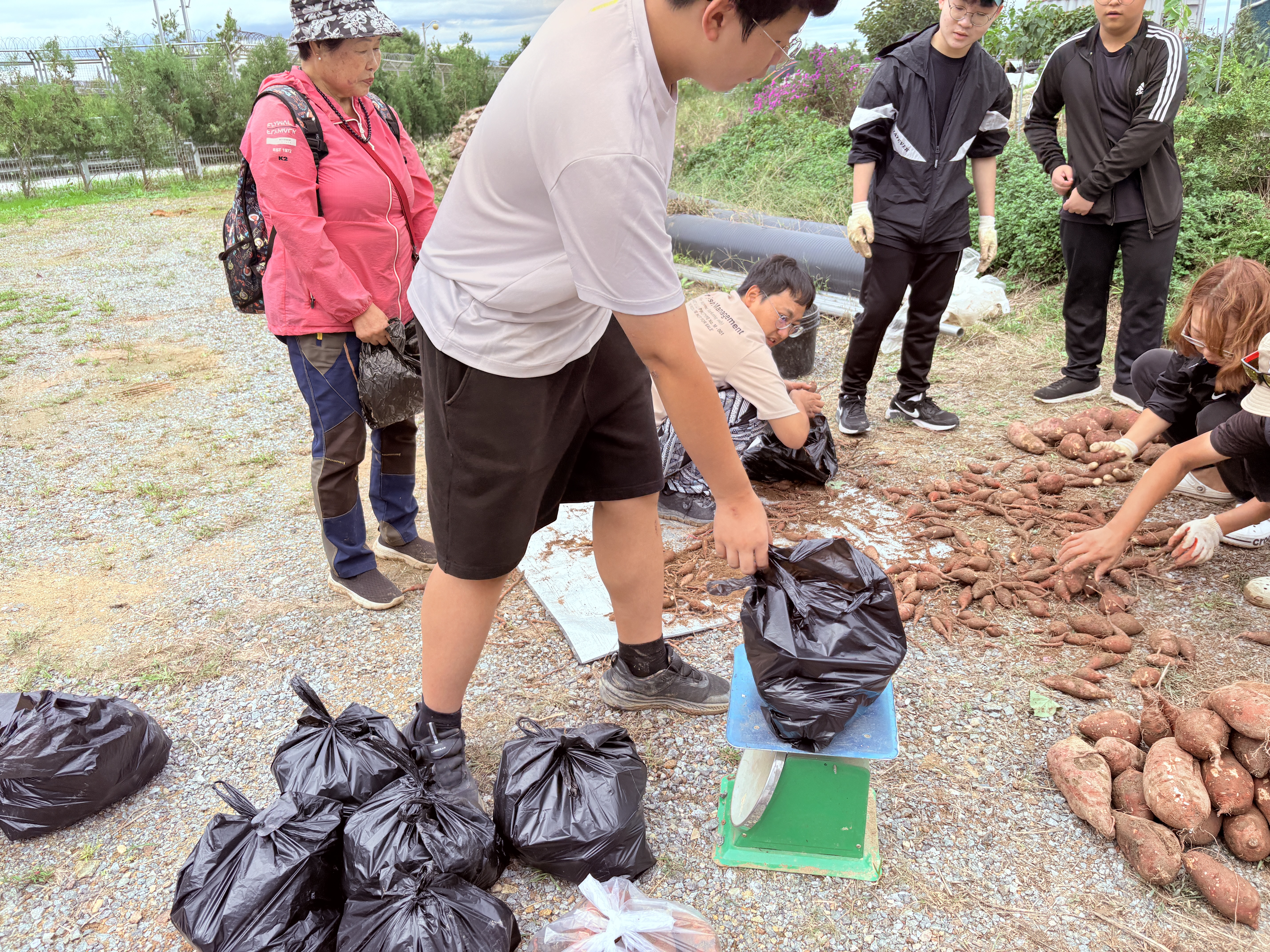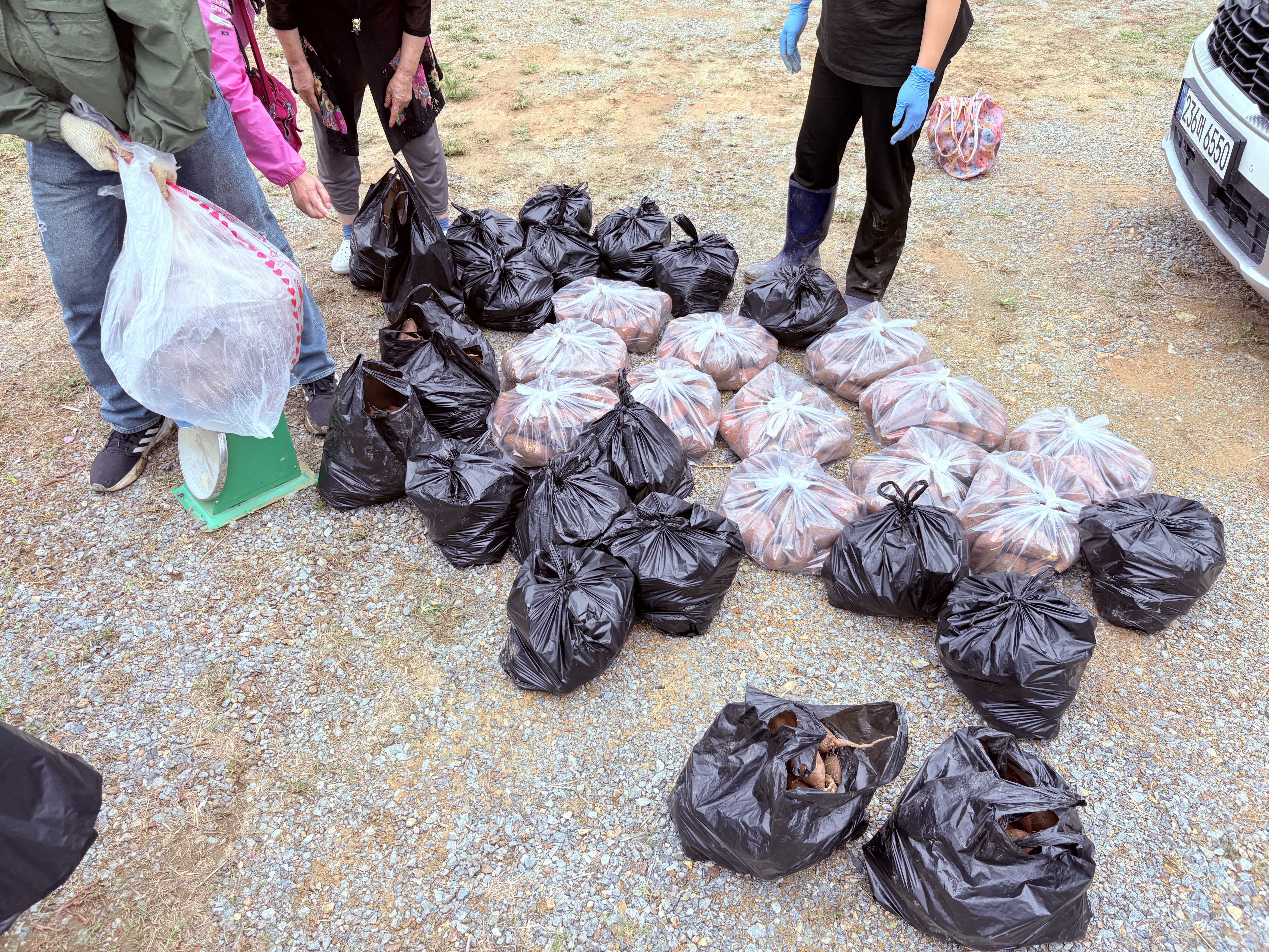 이게 다 고구마라면 믿기시나요? 한 봉지당 6kg 정도로 맞춰서 큰 고구마, 작은 고구마 다양하게 넣었습니다. 양이 많아서 다들 한 봉지씩 들고 가도 고구마가 남아 나머지 고구마는 복지관에 필요한 분들에게 나눠드리려고 합니다.