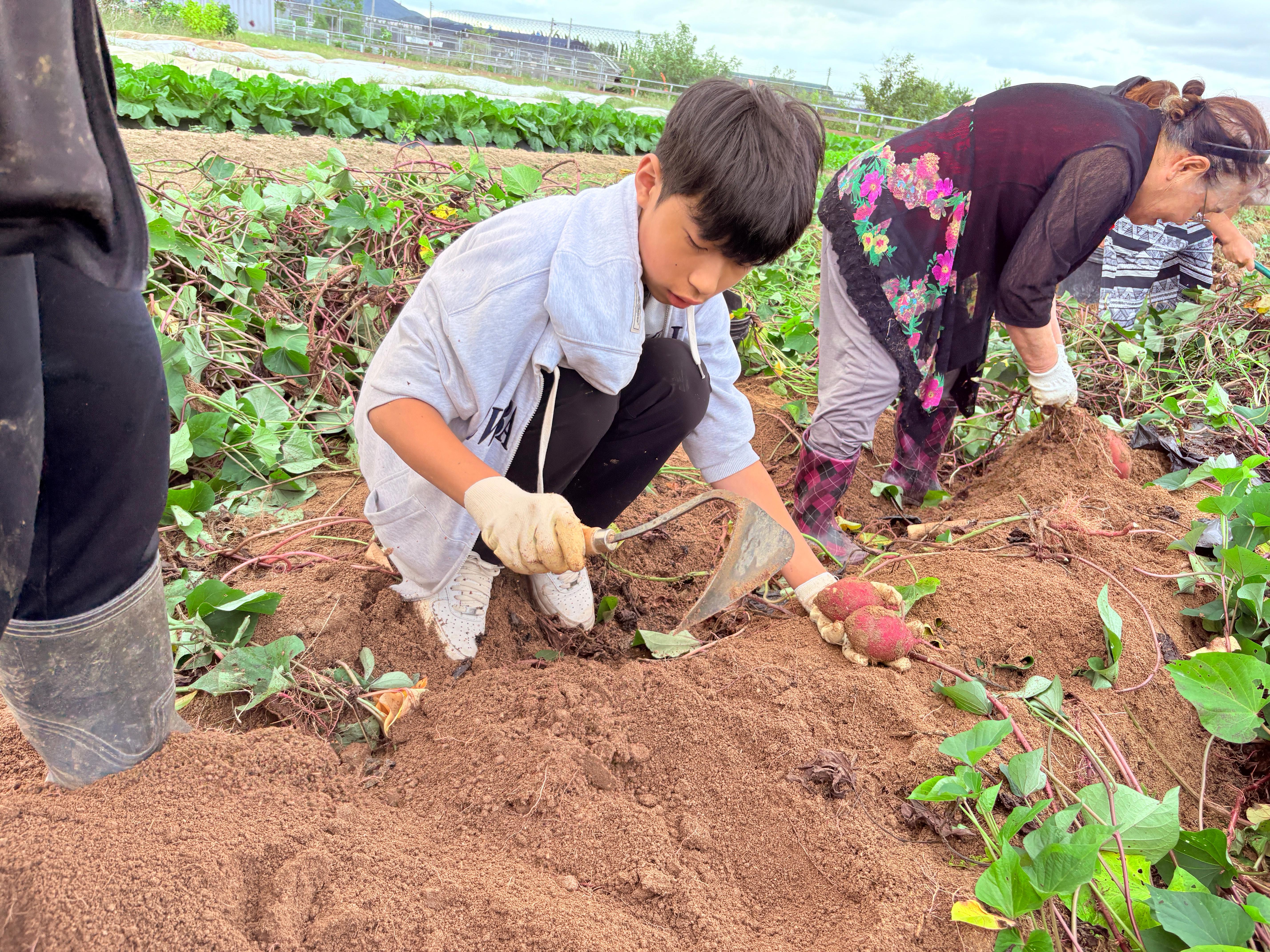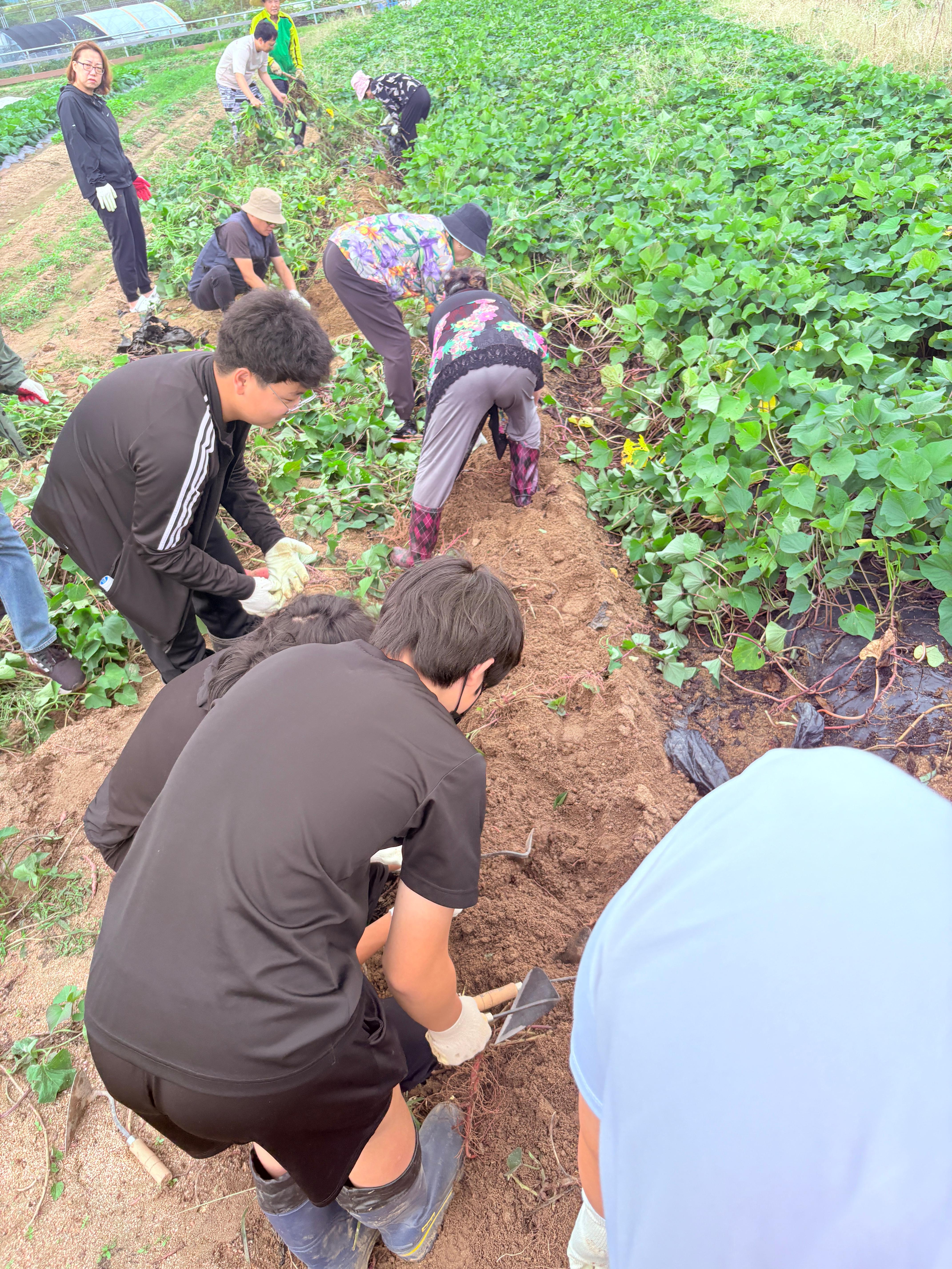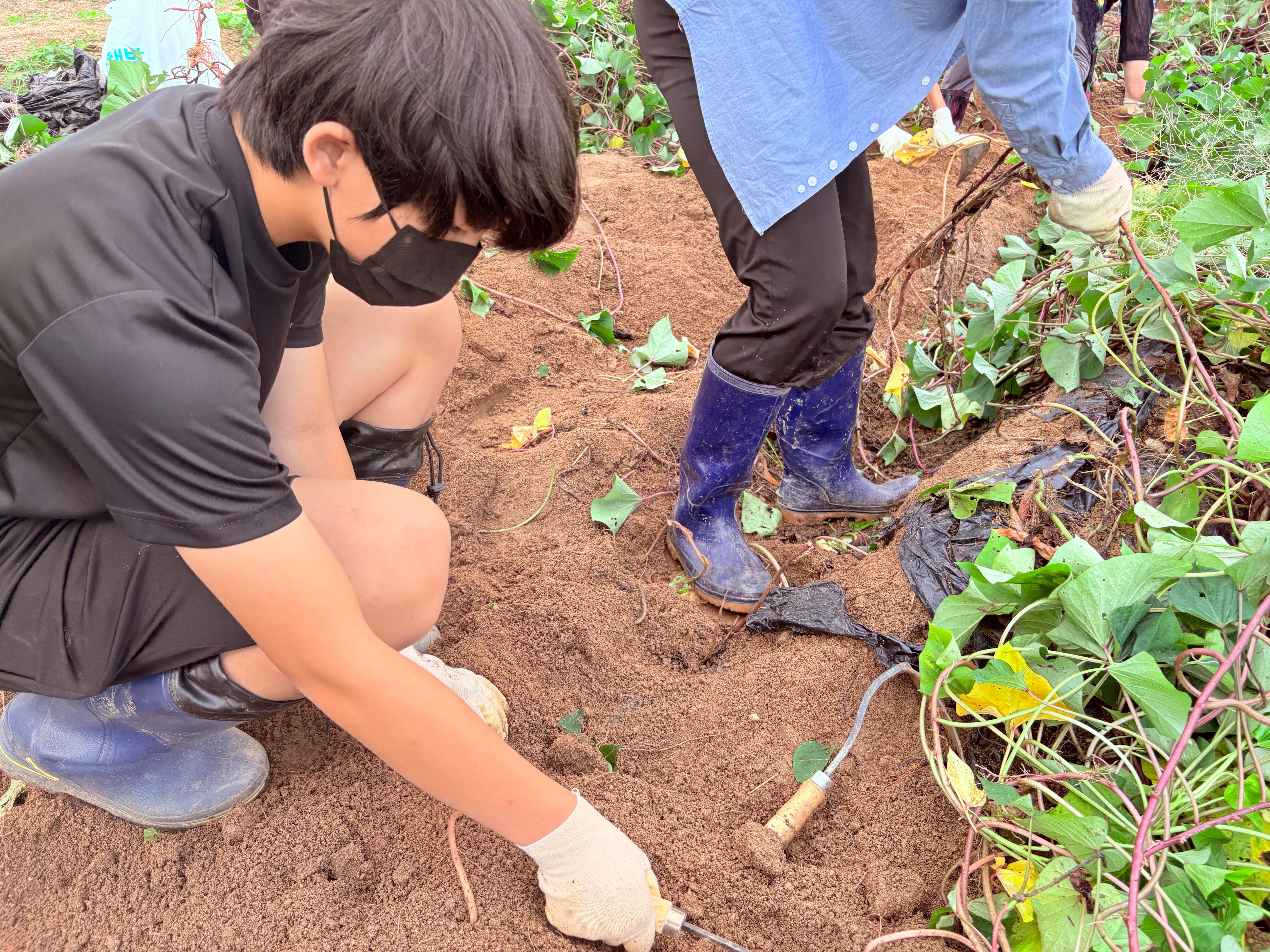 고구마 줄기를 걷어내고 본격적으로 호미로 흙을 파내자 고구마들이 하나 둘 얼굴을 내밉니다. 그중에서 크기가 꽤 큰 고구마를 캔 한 친구가 큰 소리로 이야기합니다. 그러자 시선은 한 곳에 모이고 이윽고 청소년 친구들의 눈에 불이 켜져 너도나도 큰 고구마를 캐려고 열심히 흙을 파냅니다.
