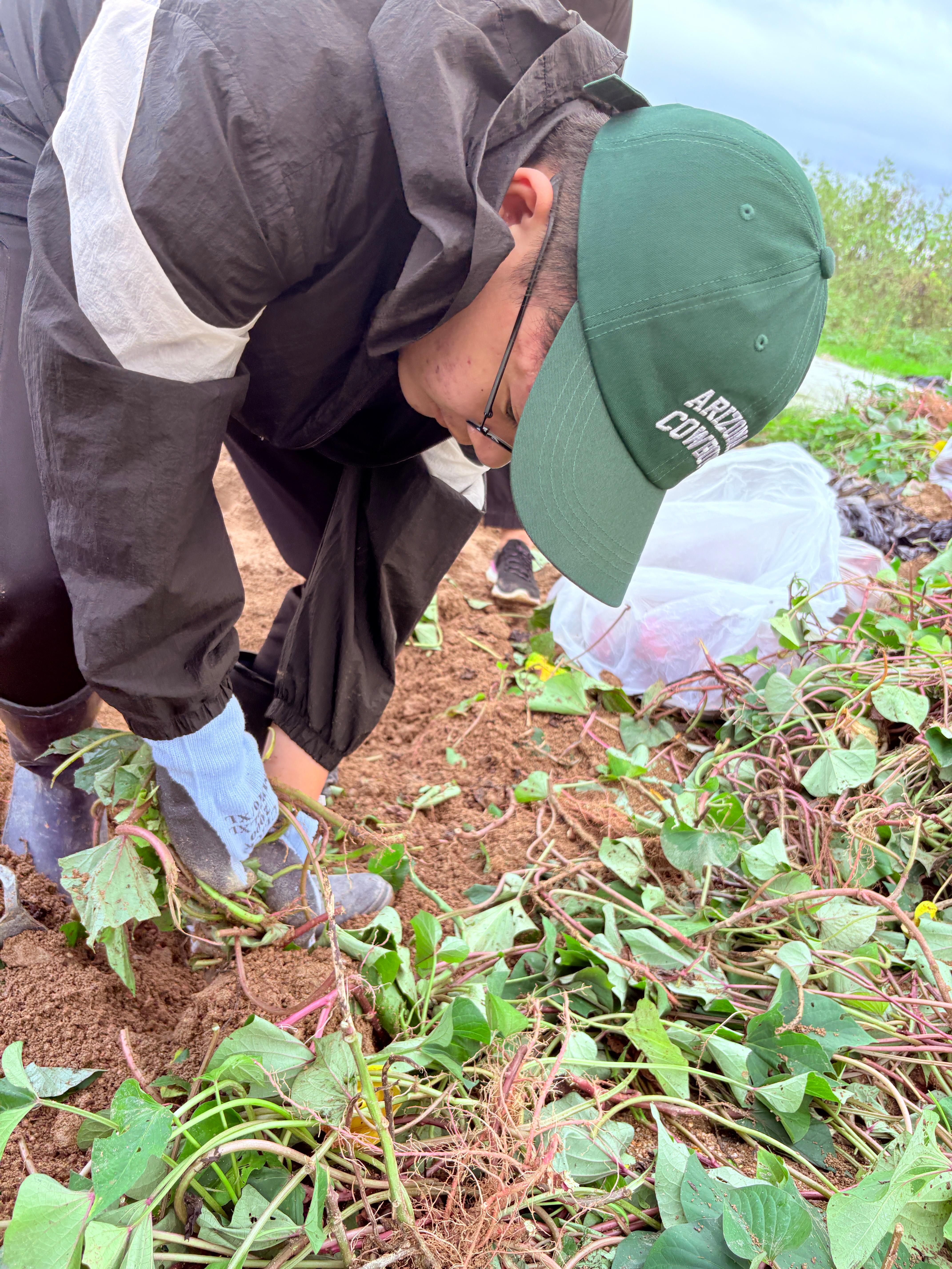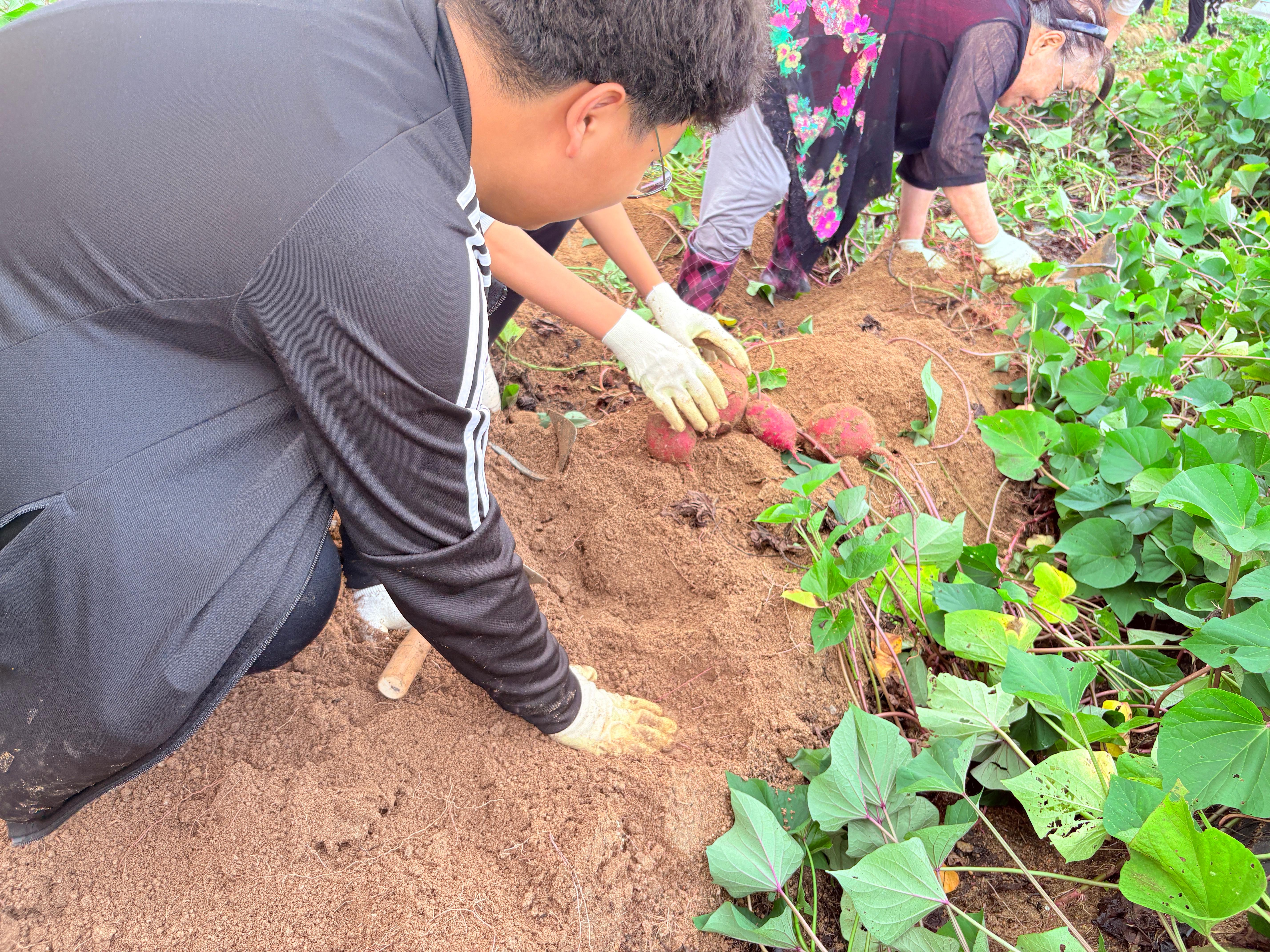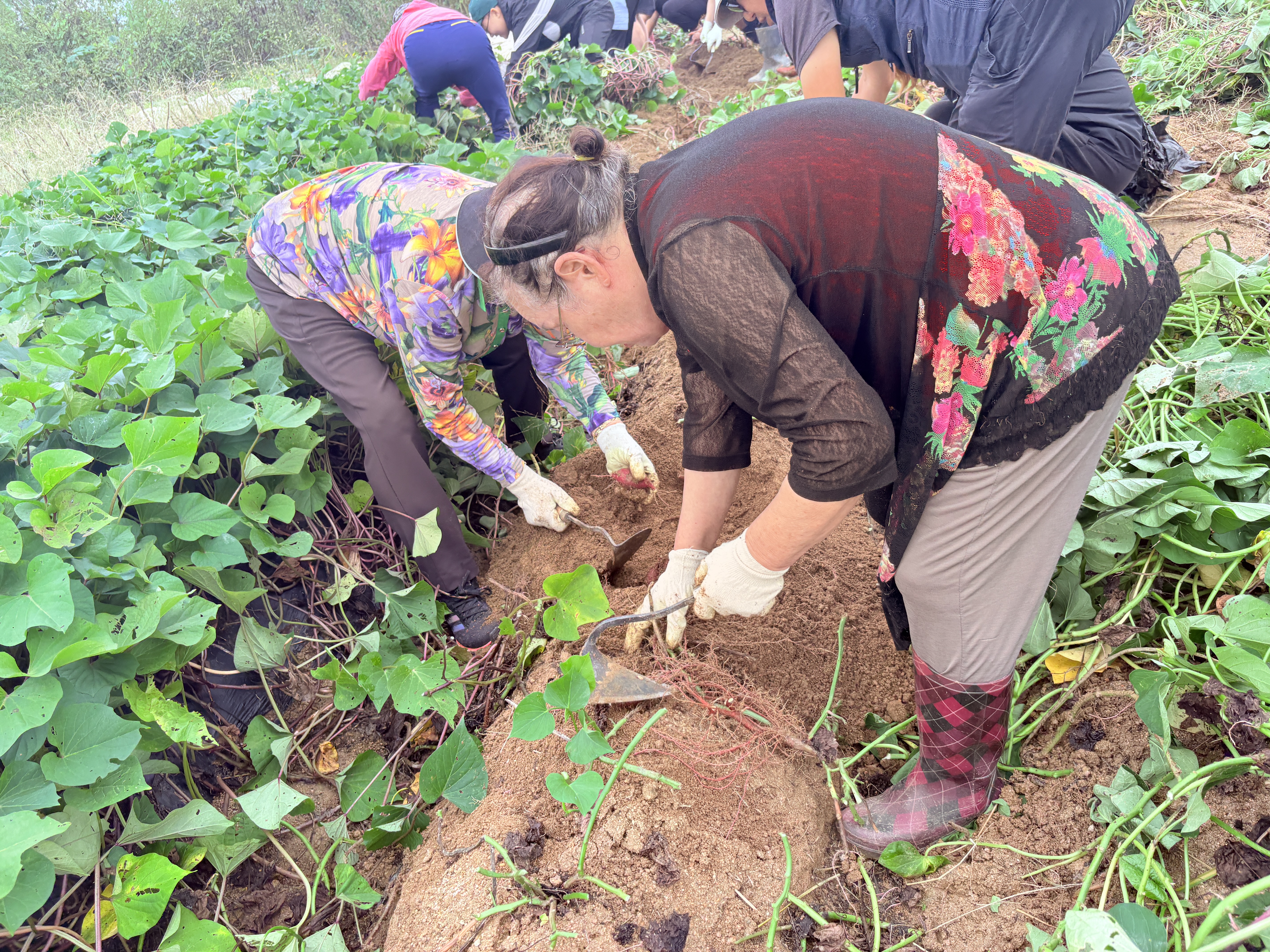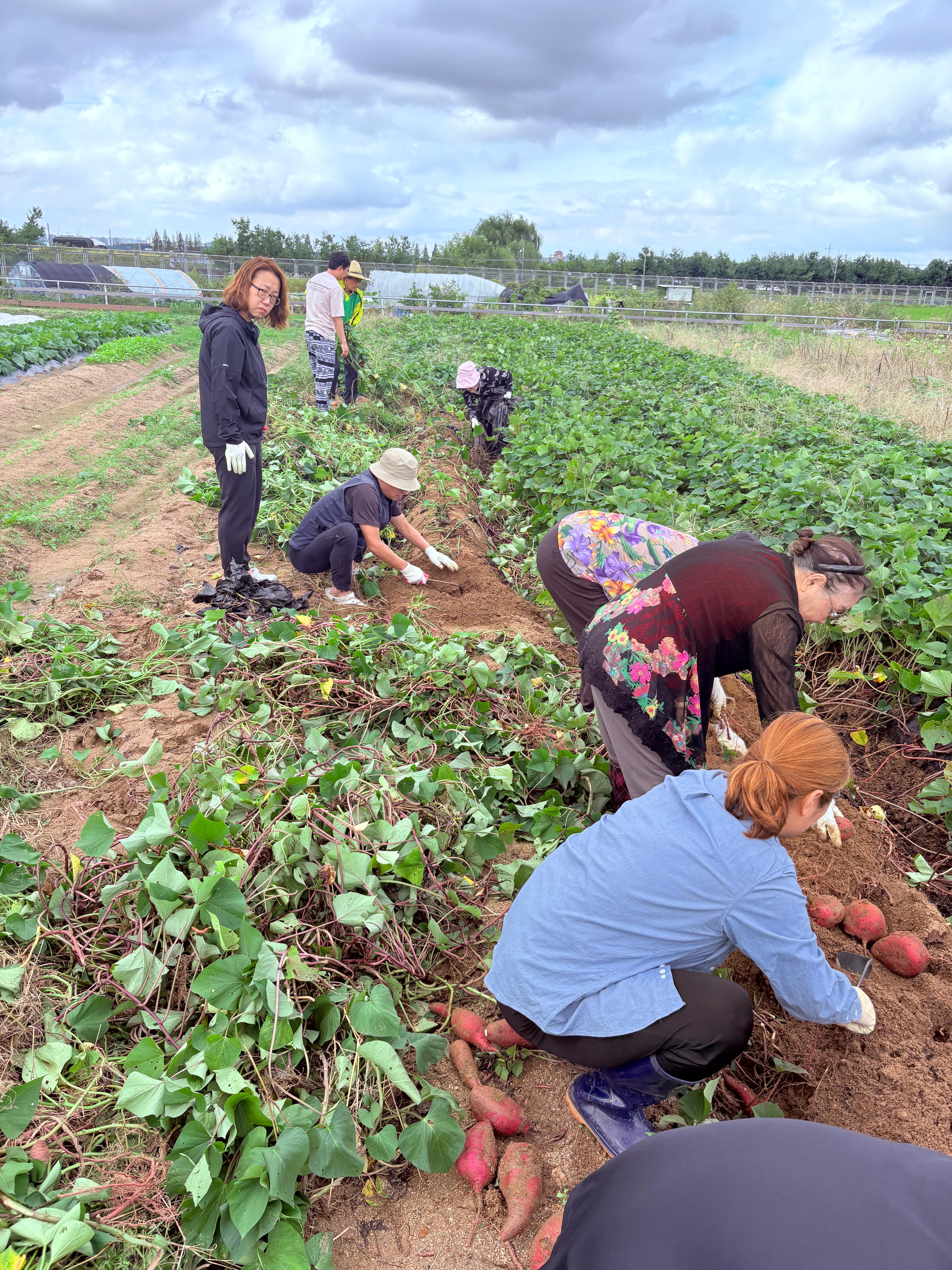 고구마 줄기를 걷어내고 본격적으로 호미로 흙을 파내자 고구마들이 하나 둘 얼굴을 내밉니다. 그중에서 크기가 꽤 큰 고구마를 캔 한 친구가 큰 소리로 이야기합니다. 그러자 시선은 한 곳에 모이고 이윽고 청소년 친구들의 눈에 불이 켜져 너도나도 큰 고구마를 캐려고 열심히 흙을 파냅니다.