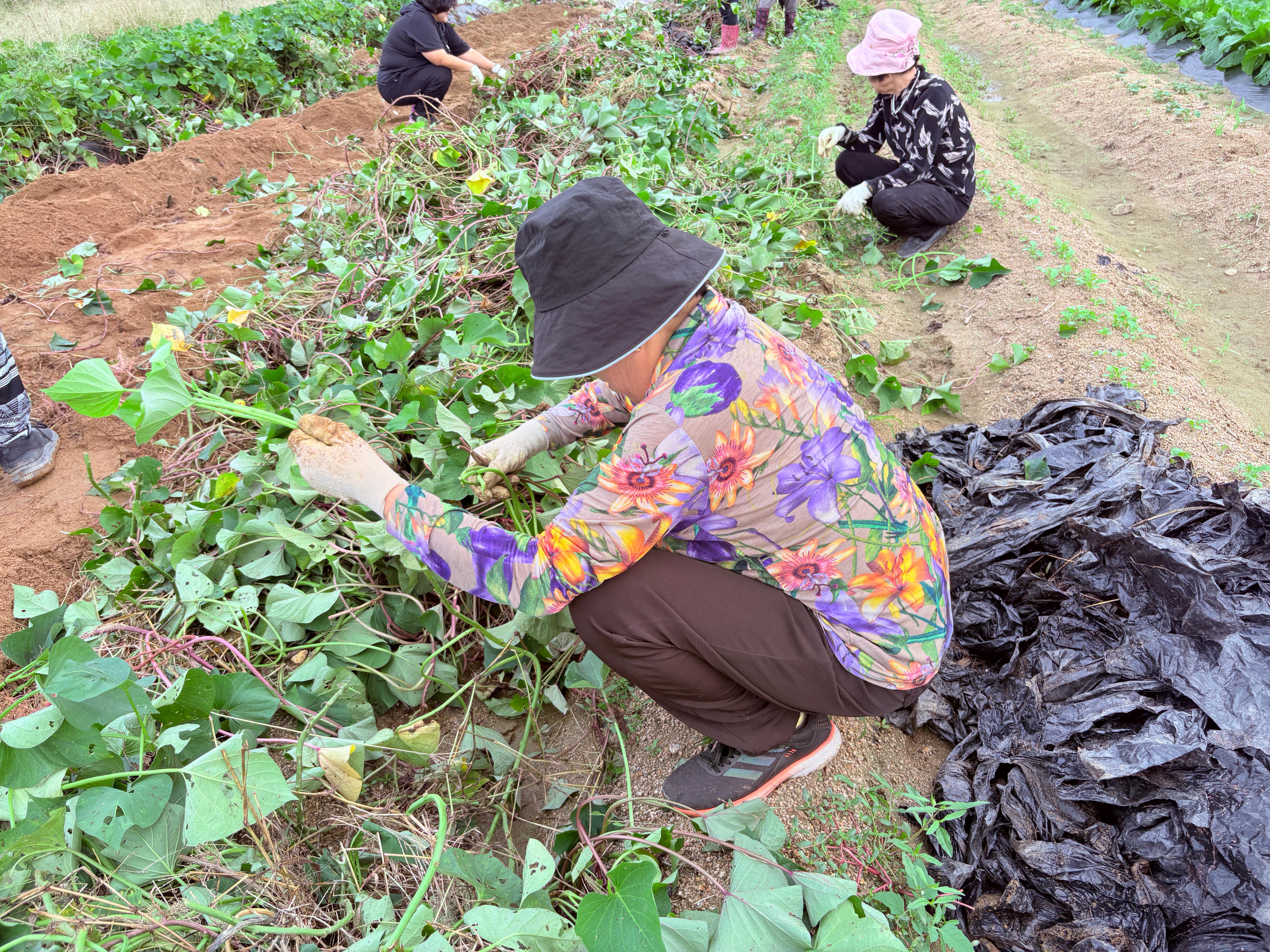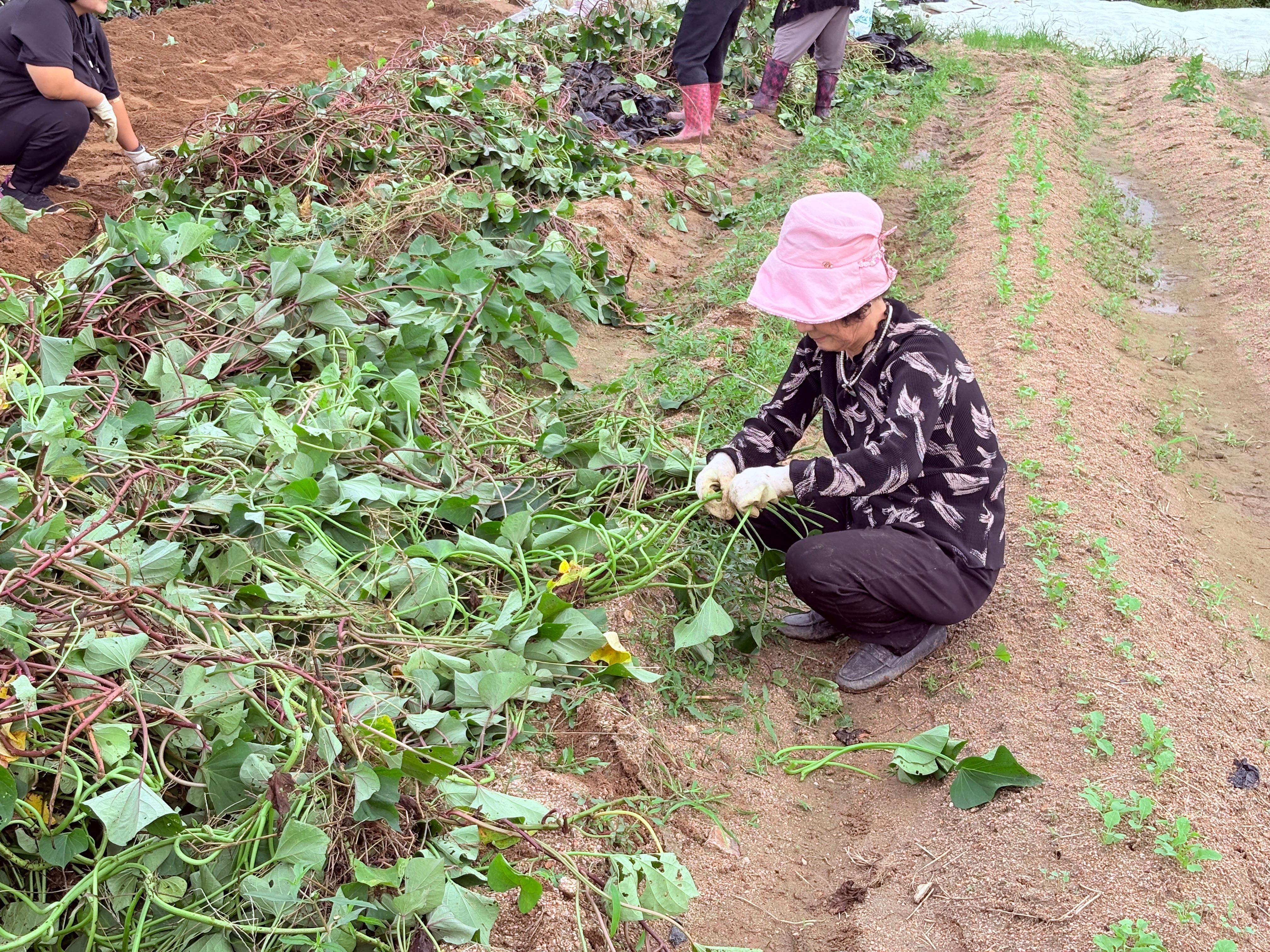 고구마에 한창 몰입하고 있을 때 비닐을 걷고 걷은 고구마 줄기를 본 어르신들께서는 연한 고구마 줄기를 가져가고 싶으셔서 자리를 잡고 한창 줄기를 고르고 계십니다. 친구들은 고구마에, 어르신들은 고구마 줄기에 열심히네요.