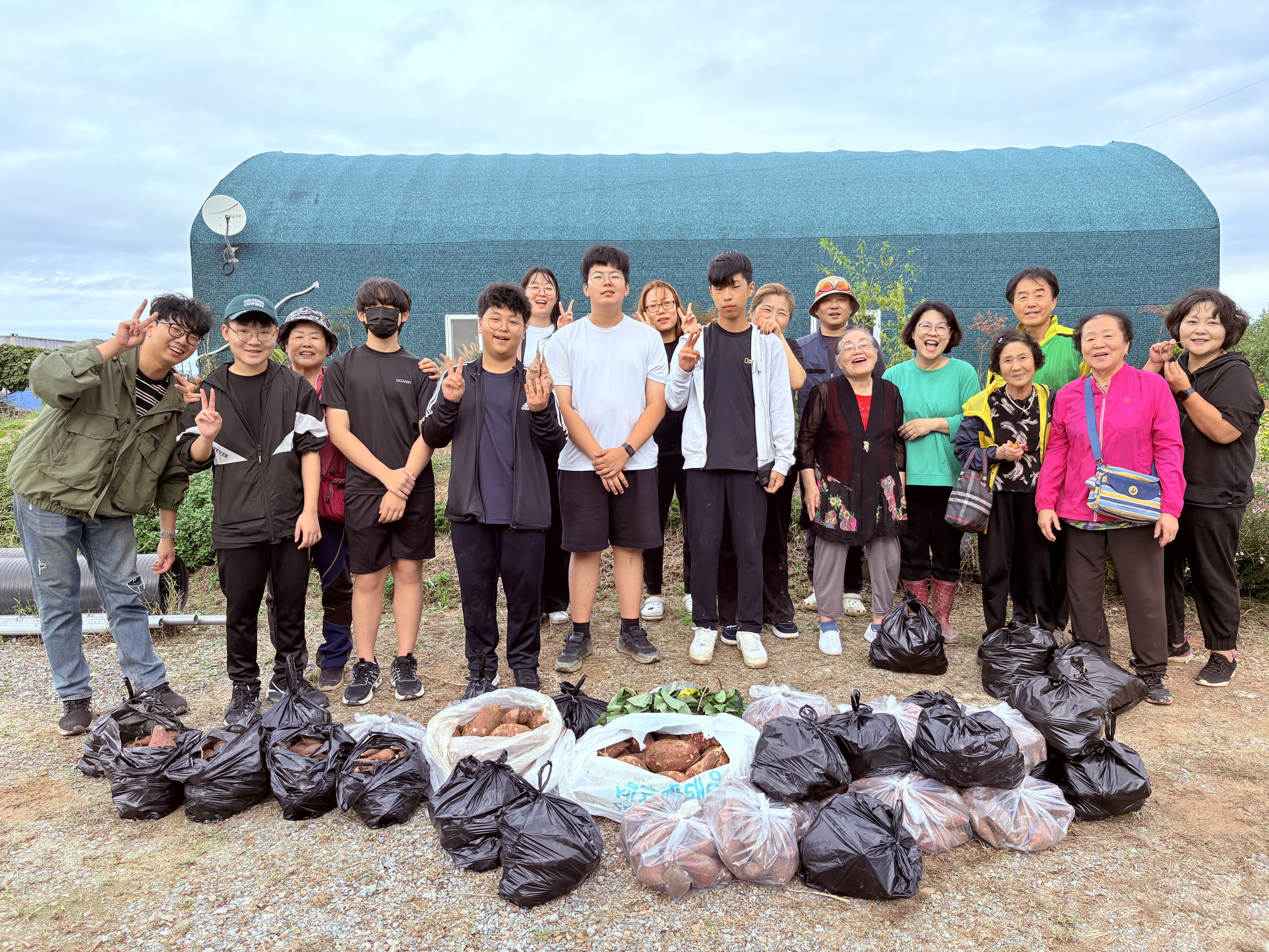 고구마 줄기가 많아서 한 봉지는 가져가라고 손에 쥐어주며, 결국 고구마 캐기가 끝났습니다. 허리를 세우며 으쌰 힘들어 하지만 수확한 고구마를 보니 다들 뿌듯해하는 모습이 보입니다.