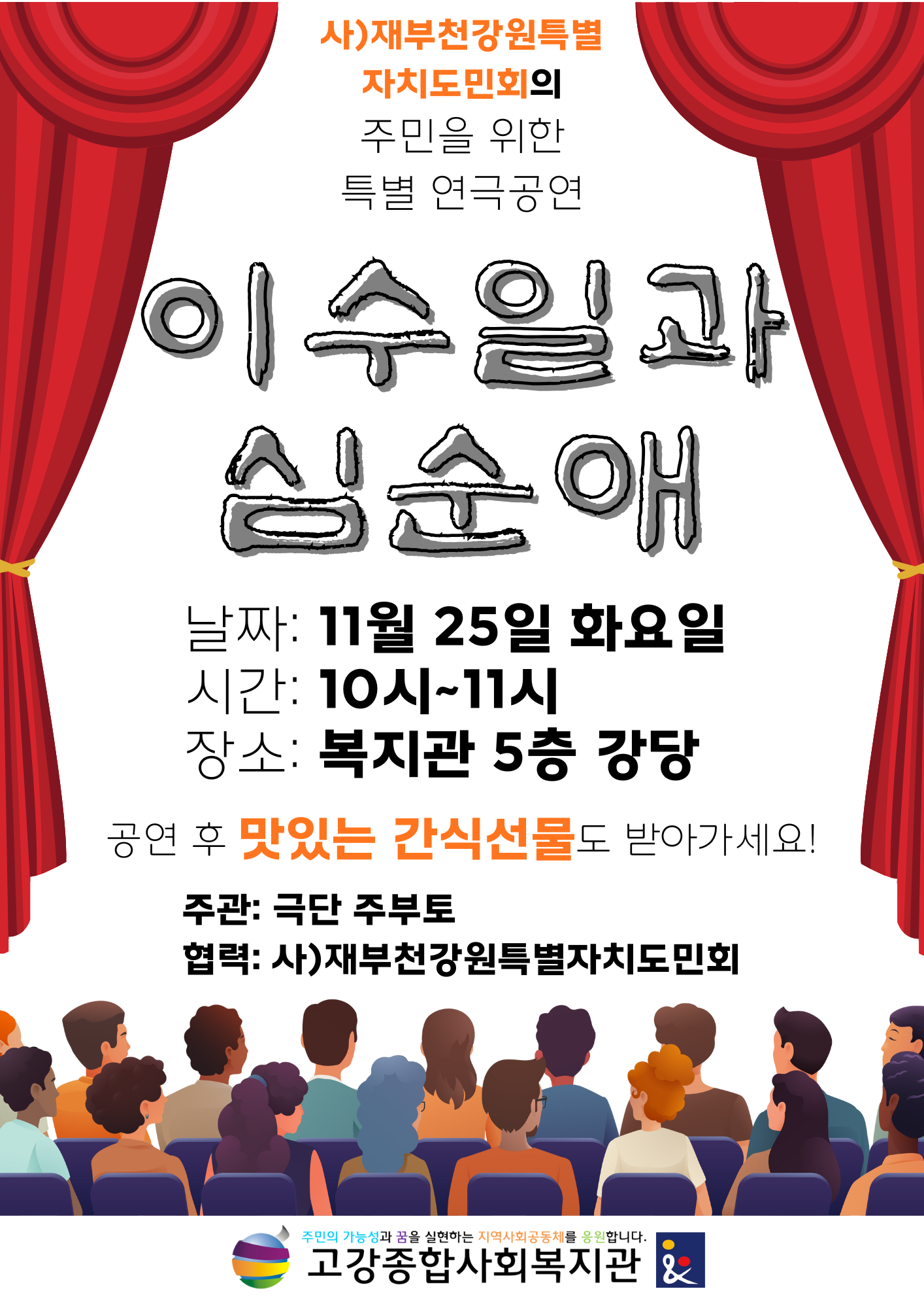 주)재부천강원특별자치도민회에서 진행하는 주민을 위한 특별 연극공연을 진행합니다~!