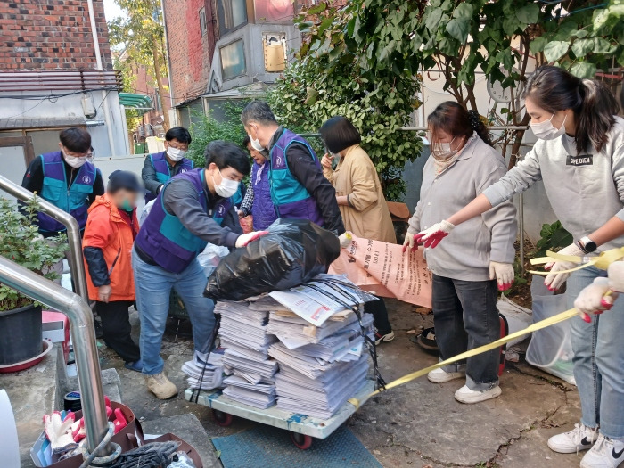 생활에 보탬이 되고자 모았던 신문, 폐가전, 옷가지까지. 산더미처럼 쌓인 짐들에게 자리를 내어주고 화장실도 나가서 이용해야 했던 이철수님을 위해 소중한 시간을 내 와주신 지역사회보장협의체 위원들과 통장님, 고강 1동 복지과, 그리고 우리 복지관 수주팀!
