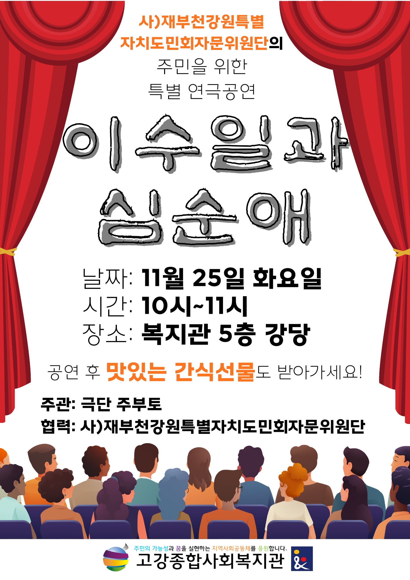 모든 극이 끝난 후에는 재)부천강원특별자치도민회 자문위원단이 준비한 간식을 나눠드렸습니다.