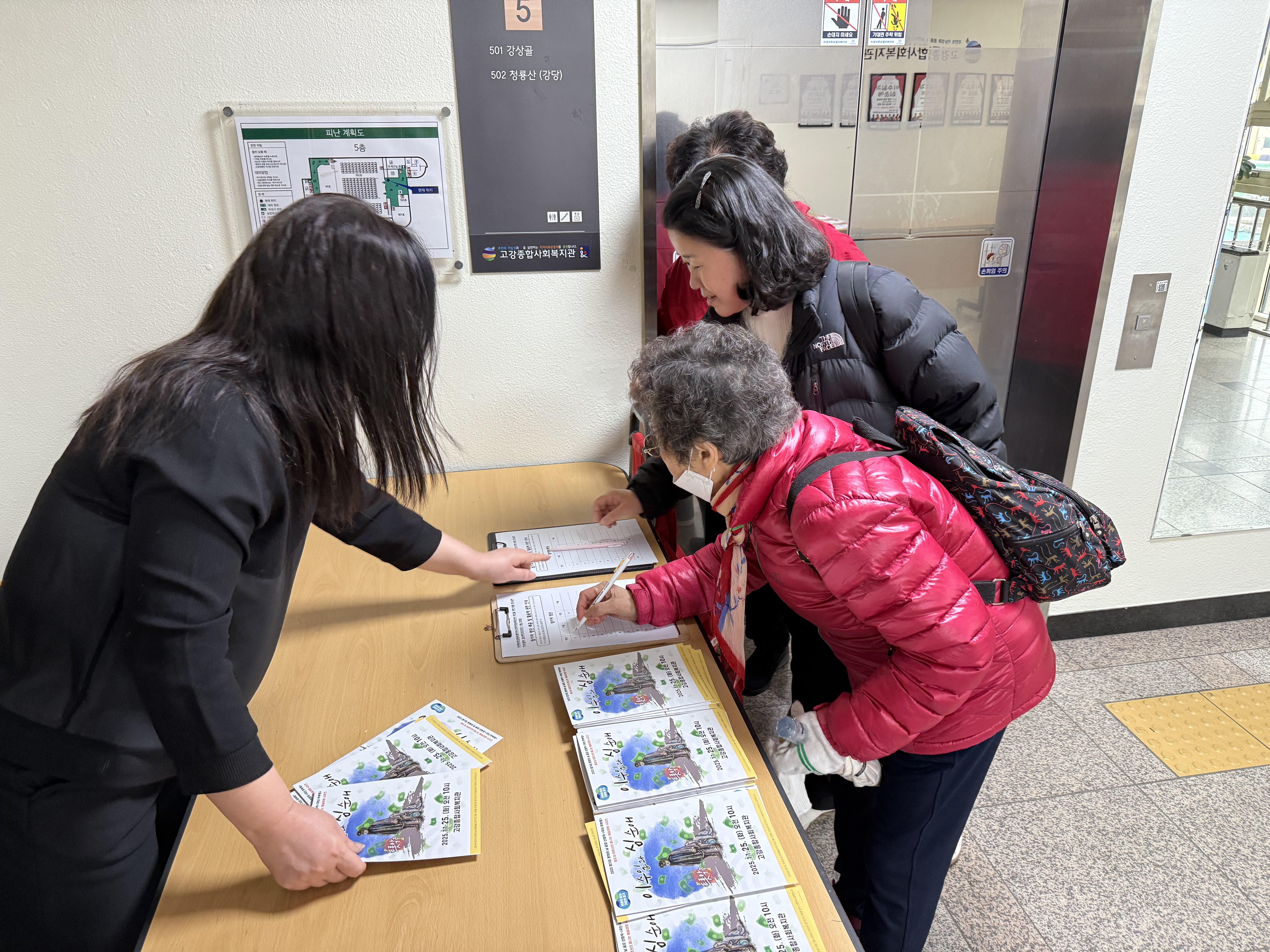 먼저는 포스터를 만들어 복지관 내에 부착하고, 지역주민들이 속해 있는 오픈 카카오톡방, 고강본동 주민자치회 등 많은 단체들에게도 홍보했습니다.