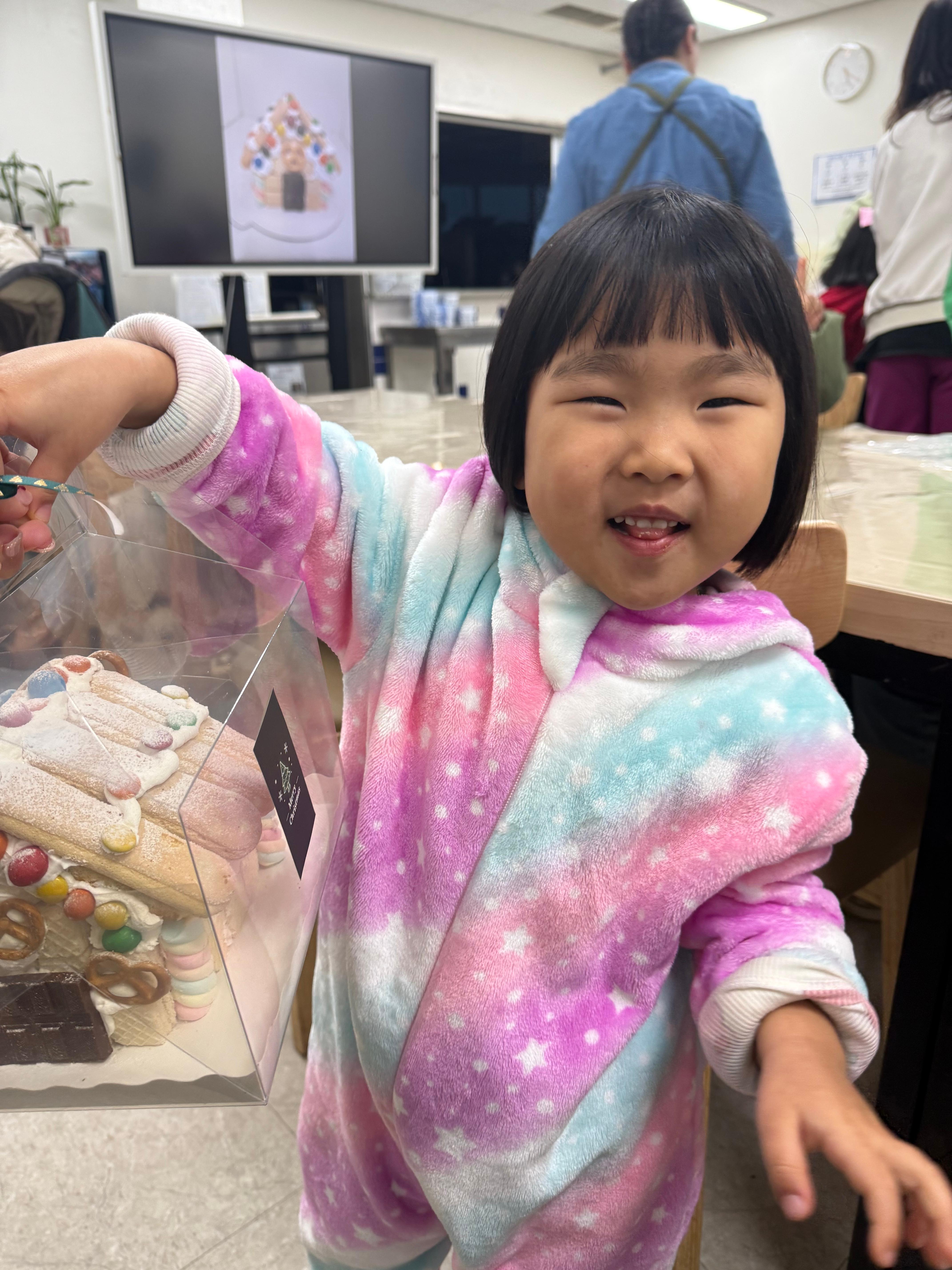 두 번째 시간에는 더욱 특별한 크리스마스 과자집 케이크 만들기에 도전했어요! 🍰 보호자와 아이들이 삼삼오오 모여 집중하는 모습은 그 어떤 예술 작품보다 아름다웠답니다. 과자와 생크림으로 뚝딱뚝딱! 멋진 크리스마스 하우스를 완성하는 아이들의 얼굴에는 뿌듯함과 행복이 가득했어요.