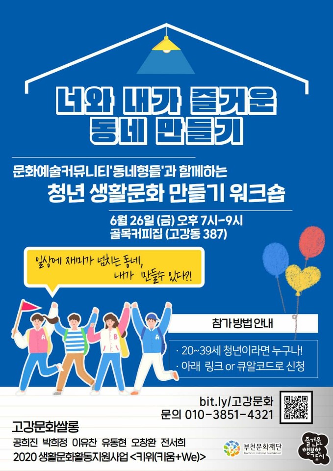 청년 생활문화 만들기 워크숍을 통해 고강동 내 청년 문화예술가 및 문화활동에 관심있는 청년을 발굴하고 향후 이어질 청년 활동에 참여할 수 있도록 한다.