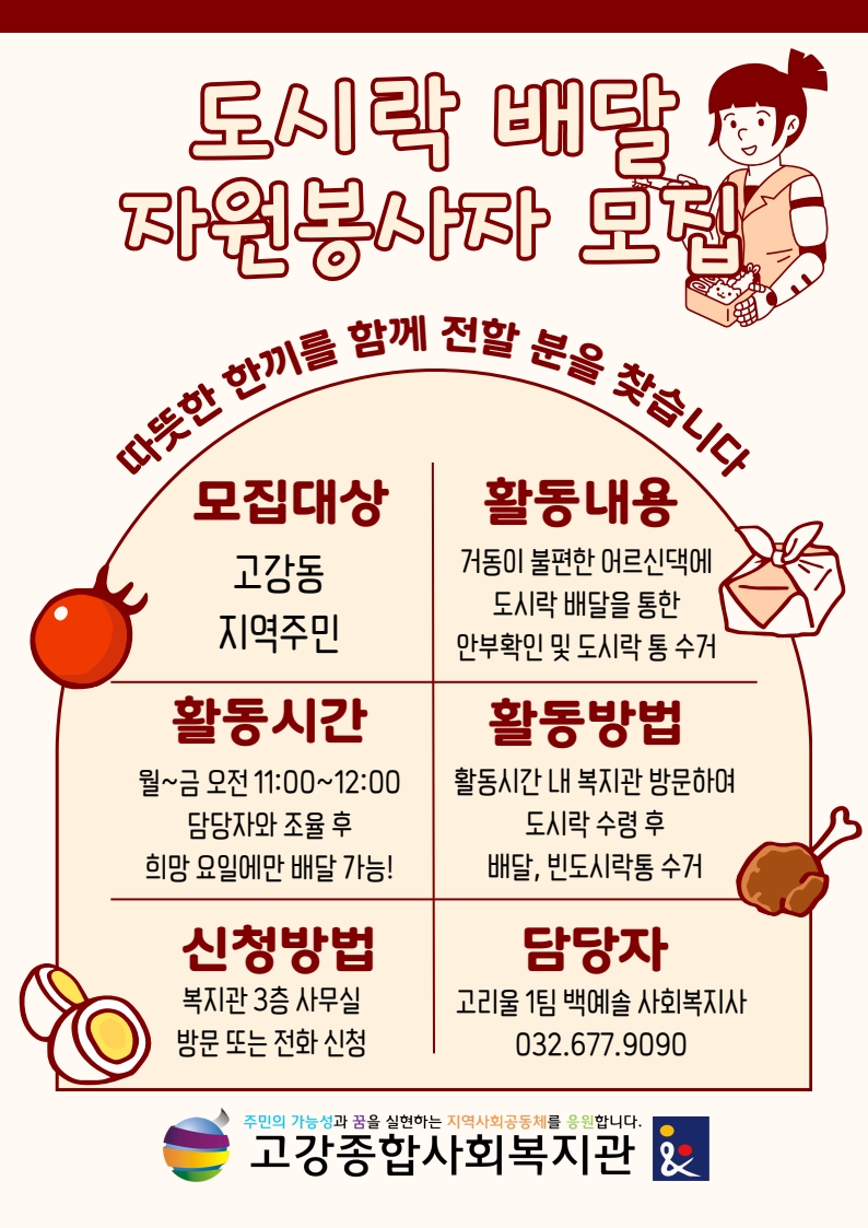 (배달 봉사로 또는 경로식당 주방봉사로 함께 하시고 싶은 봉사자분들 있으면 언제든 복지관으로 연락주시기 바랍니다!^^)