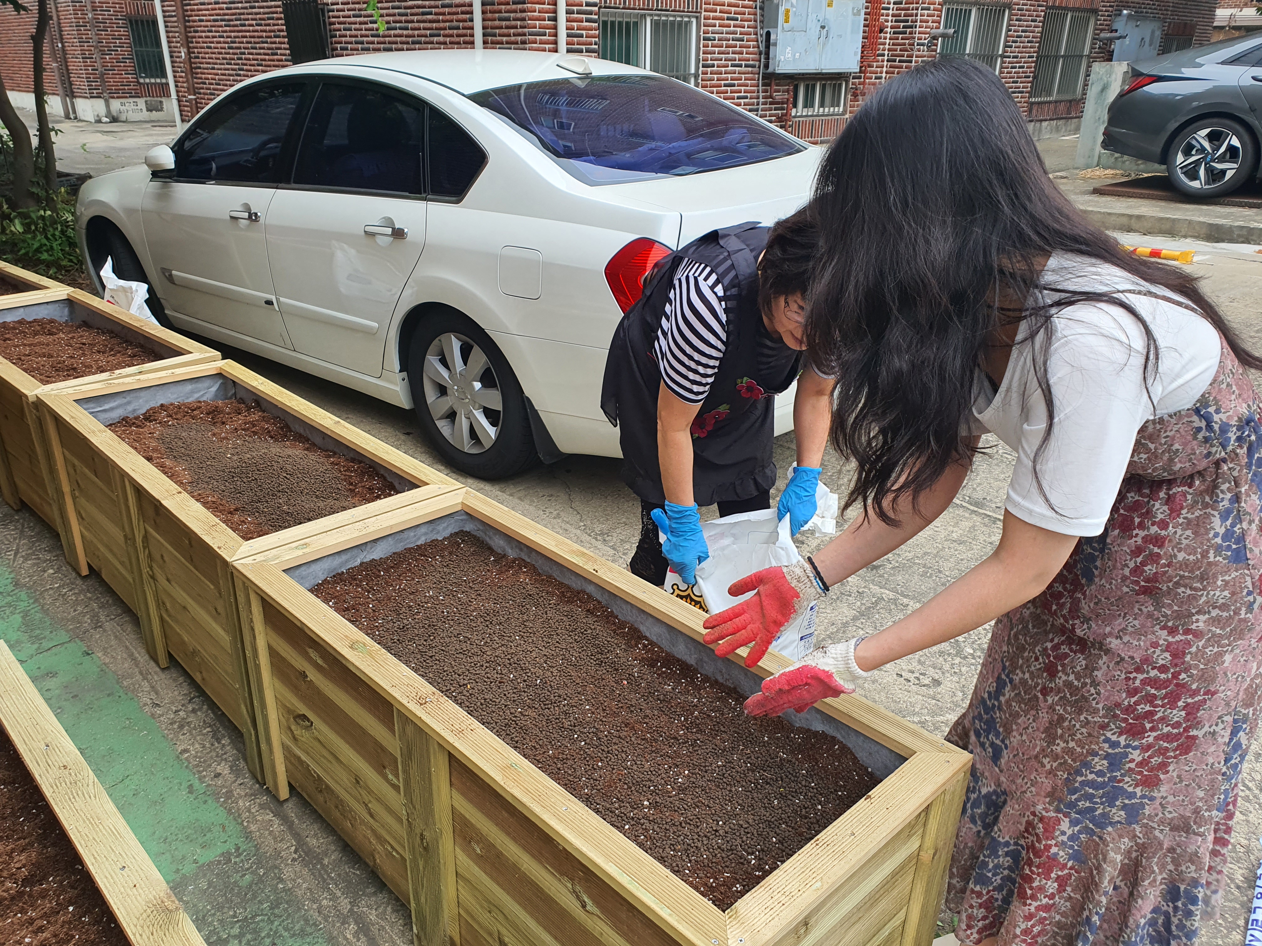 도착해보니 이미 텃밭상자안에는 흙으로 가득 차 있었습니다.