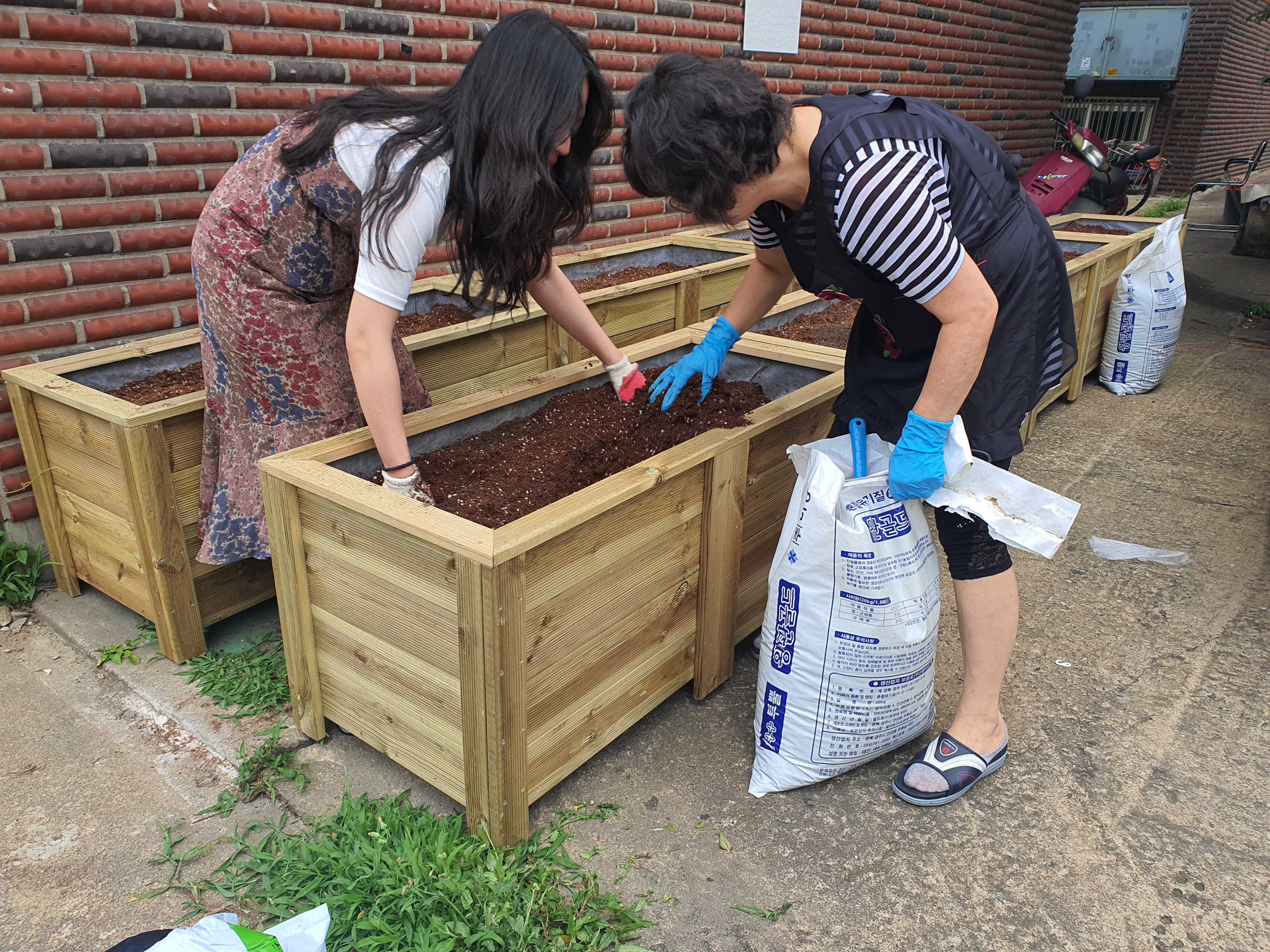 통장님과 10개의 텃밭상자 안에 거름을 다 채워 넣었습니다.