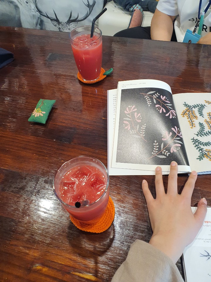 프랑스 자수 이야기는 잠시 멈추고, 여름맞이 새롭게 개시한 수박주스를 마시며 사장님과 이야기를 나눕니다.
