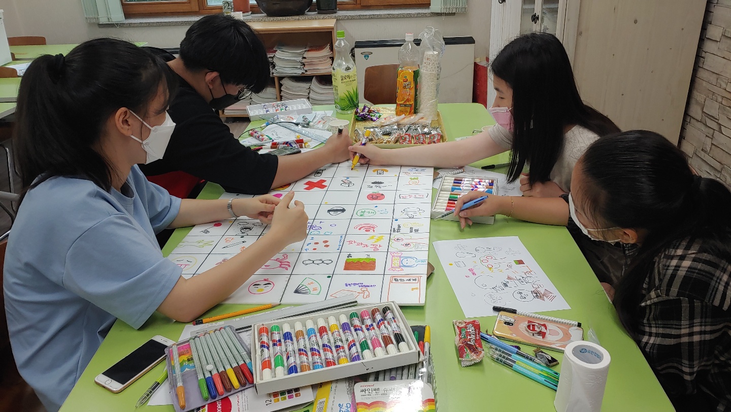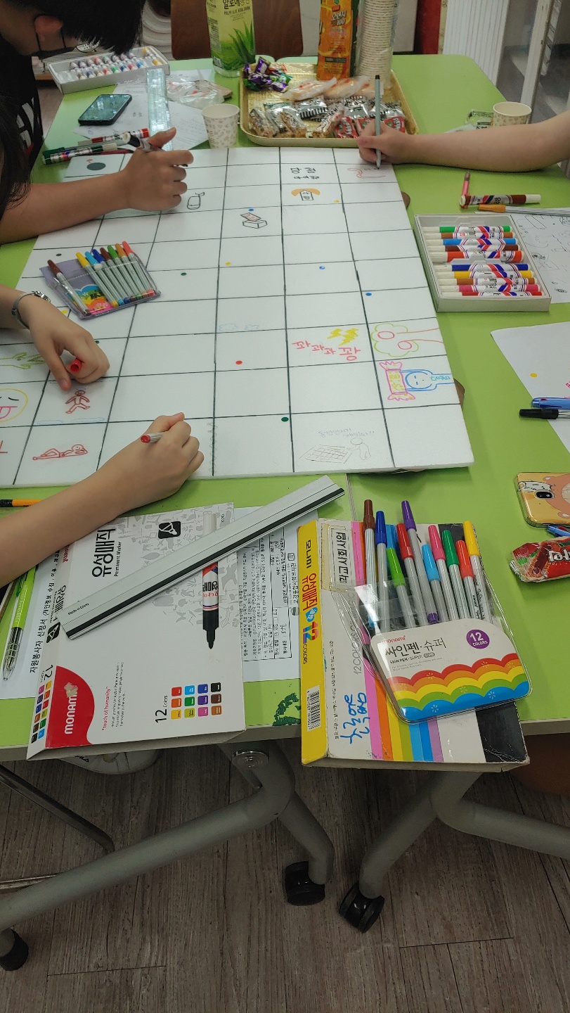 바로 동전던지기 판인데요! 당첨 칸을 몇 칸으로 할지, 당첨자에게는 어떤 경품을 줄지 등을 토의와 투표를 통해 결정했습니다. 그리고 열심히 만들기! 꽝인 칸에도 정성을 들여 그림을 그립니다.