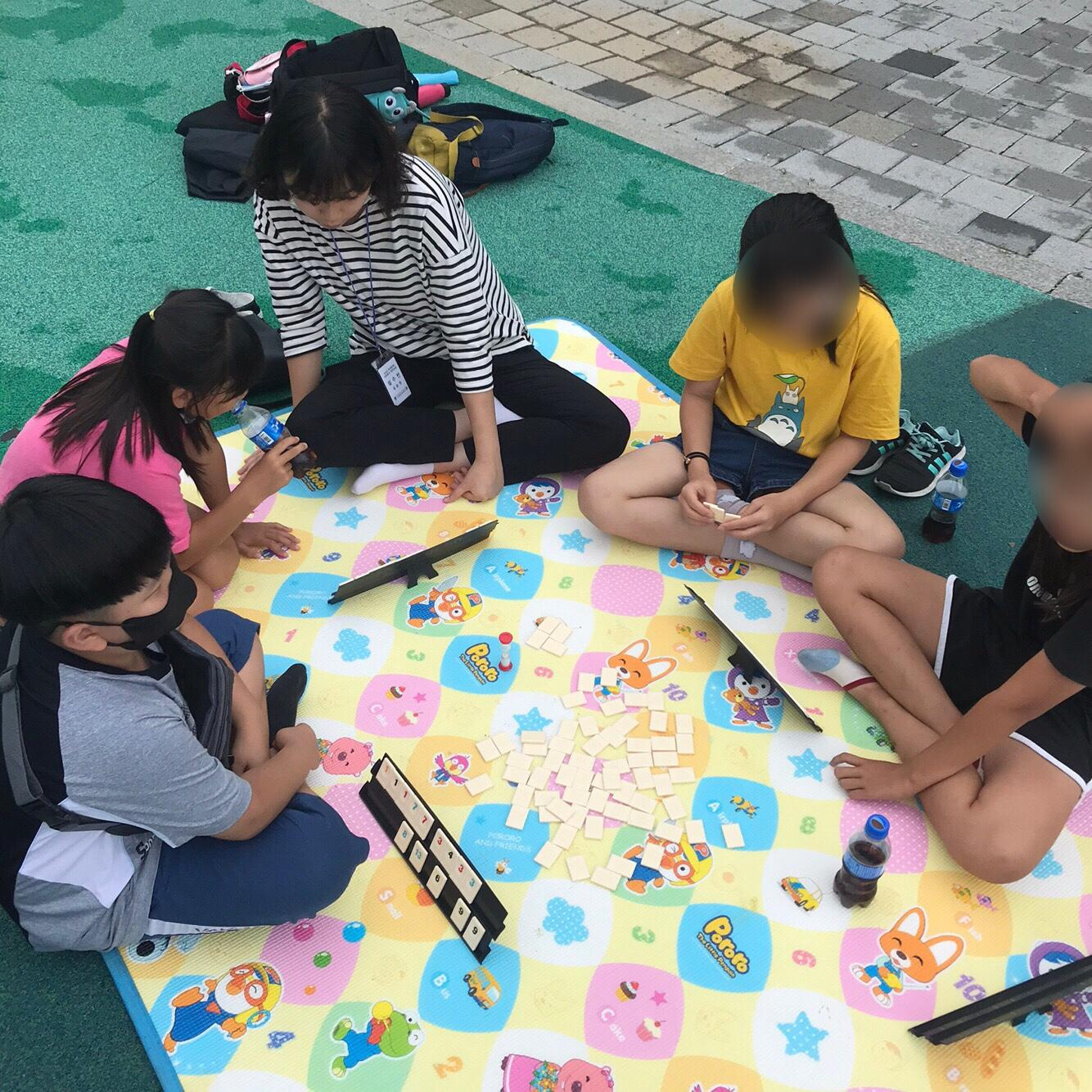 아이들이 보드게임을 준비하고 피구게임에 쓰일 고무 원반을 가져와 함께 놀이를 할 수 있었습니다.