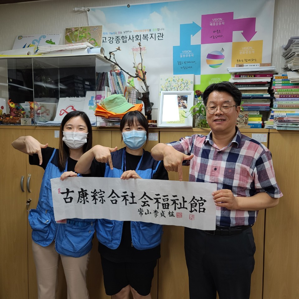 관장님께 붓글씨를 선물해드리며 함께 사진을 찍었습니다. 관장님은 너무 멋지다며 좋아하셨습니다.