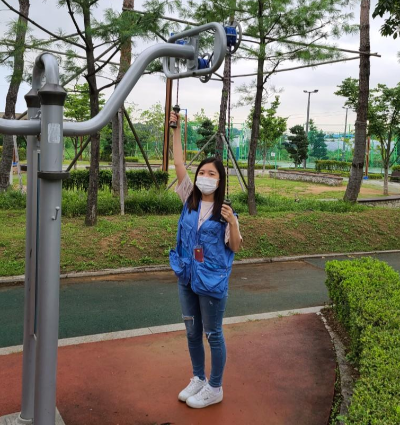 (아주머니): 로프당기기 줄이 너무 짧아서 불편해. 팔이 아파. 나는 키가 작아서 이용하기가 힘들어. 시청에 몇 번 민원을 넣었는데, 세금으로 하는 거라 안 된다고 하더라고.