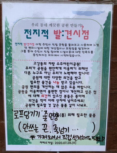 저희는 오늘 일을 계기로 ‘전지적 발: 견 시점’이라는 프로젝트를 기획했습니다. 이 프로젝트는 공원 편의 증진이라는 목적을 달성하면서 주민의 주체성을 살리기 위해 만들어졌습니다. 공원에 대한 불만을 인터뷰하고, 필요한 물건은 기부, 후원받아서 주민이 직접 공원 편의를 개선하는 활동입니다.