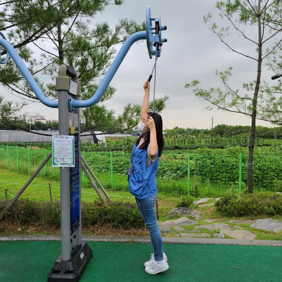 (아주머니): 로프당기기 줄이 너무 짧아서 불편해. 팔이 아파. 나는 키가 작아서 이용하기가 힘들어. 시청에 몇 번 민원을 넣었는데, 세금으로 하는 거라 안 된다고 하더라고.