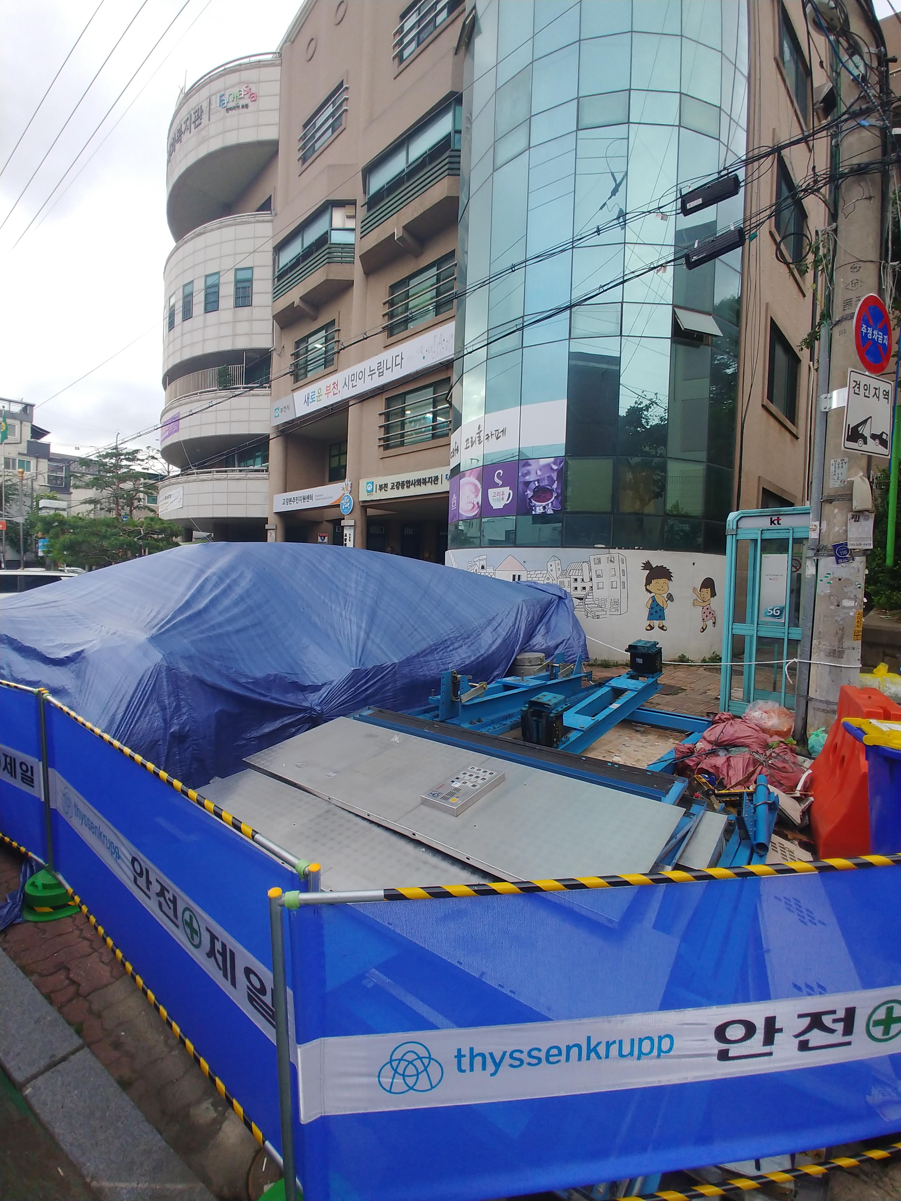 복지관 앞 주차장 한편에는 공사중엔 엘리베이터 잔해들이 놓여져있습니다.