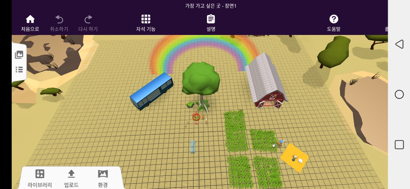 코스페이시스는 가상현실 콘텐츠를 만들 수 있는 앱입니다. 라이브러리에 있는 요소(아이템)를 삽입할 수도 있고, 인터넷이나 기기에 있는 사진, 영상, 소리 등을 삽입할 수도 있습니다.