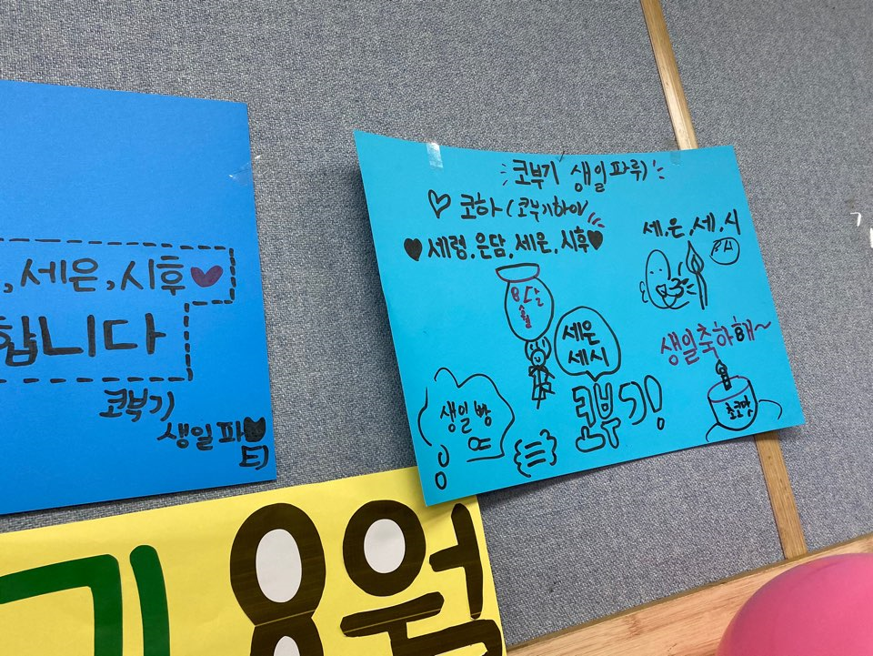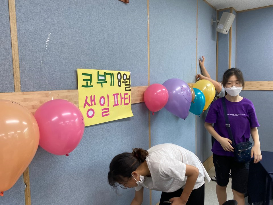 꾸미기팀은 풍선도 불고 레터링도 붙이고! 서로 축하메세지도 적으며 파티 장소를 꾸몄어요 - !