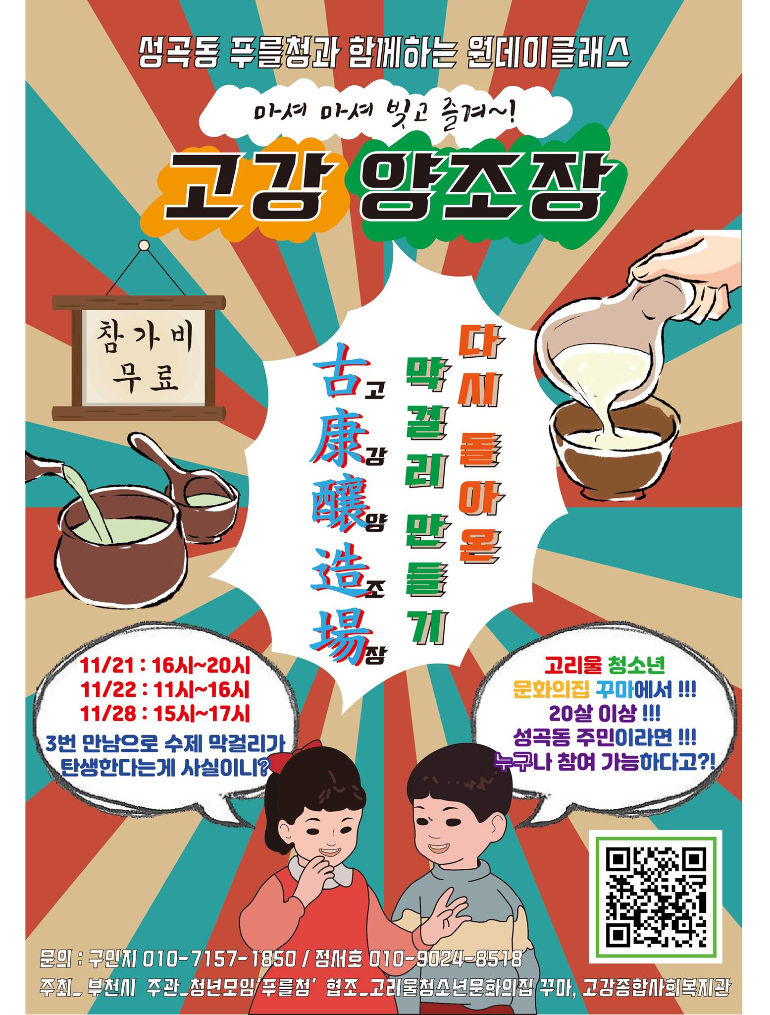 안녕하세요! 신청해주신 모든 분들 환영합니다👐🏻 ‘고강 양조장’은 푸를청에서 진행하는 막걸리 제조 클래스입니다. 이번 클래스는 나눔을 주제로, 완성된 막걸리는 참가자분들을 비롯해