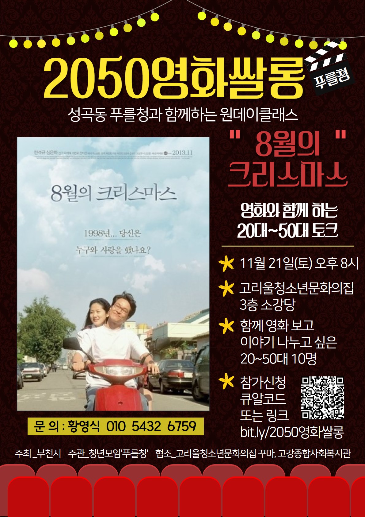 원데이클래스 2050 영화쌀롱 신청링크입니다. 동네 주민 누구나 같이 즐기는 분위기의 장이 되었으면 합니다. ● 신청 대상: 연락처 정보: 함께 영화보고 싶은 20대 이상의 여러분 ● 진행 장소 :