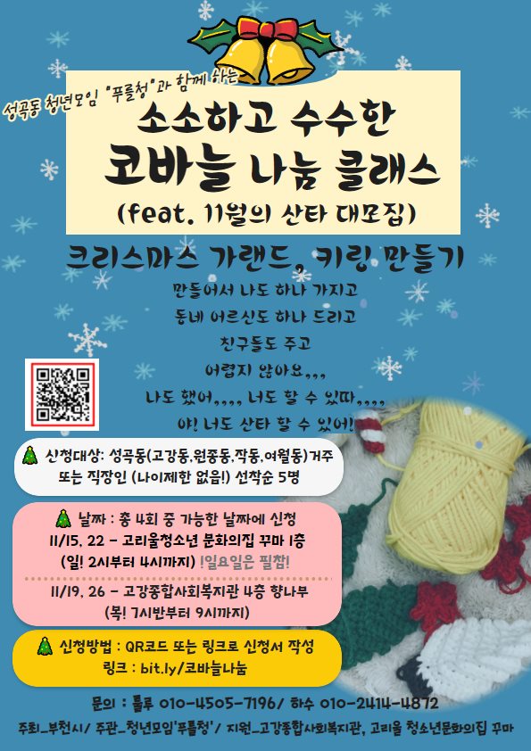 성곡동 청년모임 푸를청과 함께하는~ 마을공동체 주민제안 공모사업"성장통" 의 나눔클래스 동네 주민 누구나 함께 배우고 나눌수 있는 코바늘 클래스입니다. 이번 코바늘 클래스에서는 🎄크