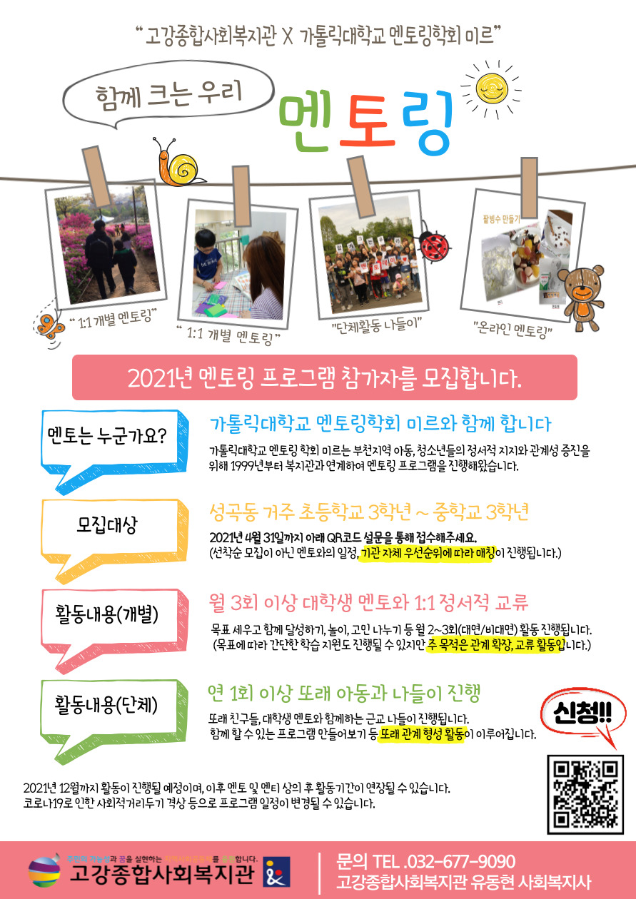 고강종합사회복지관은 지역에 살고 있는 아동·청소년들이 자신을 표현할 수 있는 사람, 타인과 관계를 맺을 수 있는 사람, 다름을 이해할 수 있는 사람으로 성장하는 것을 목적으로 멘토링 프로그램을 운영하고 있습니다.