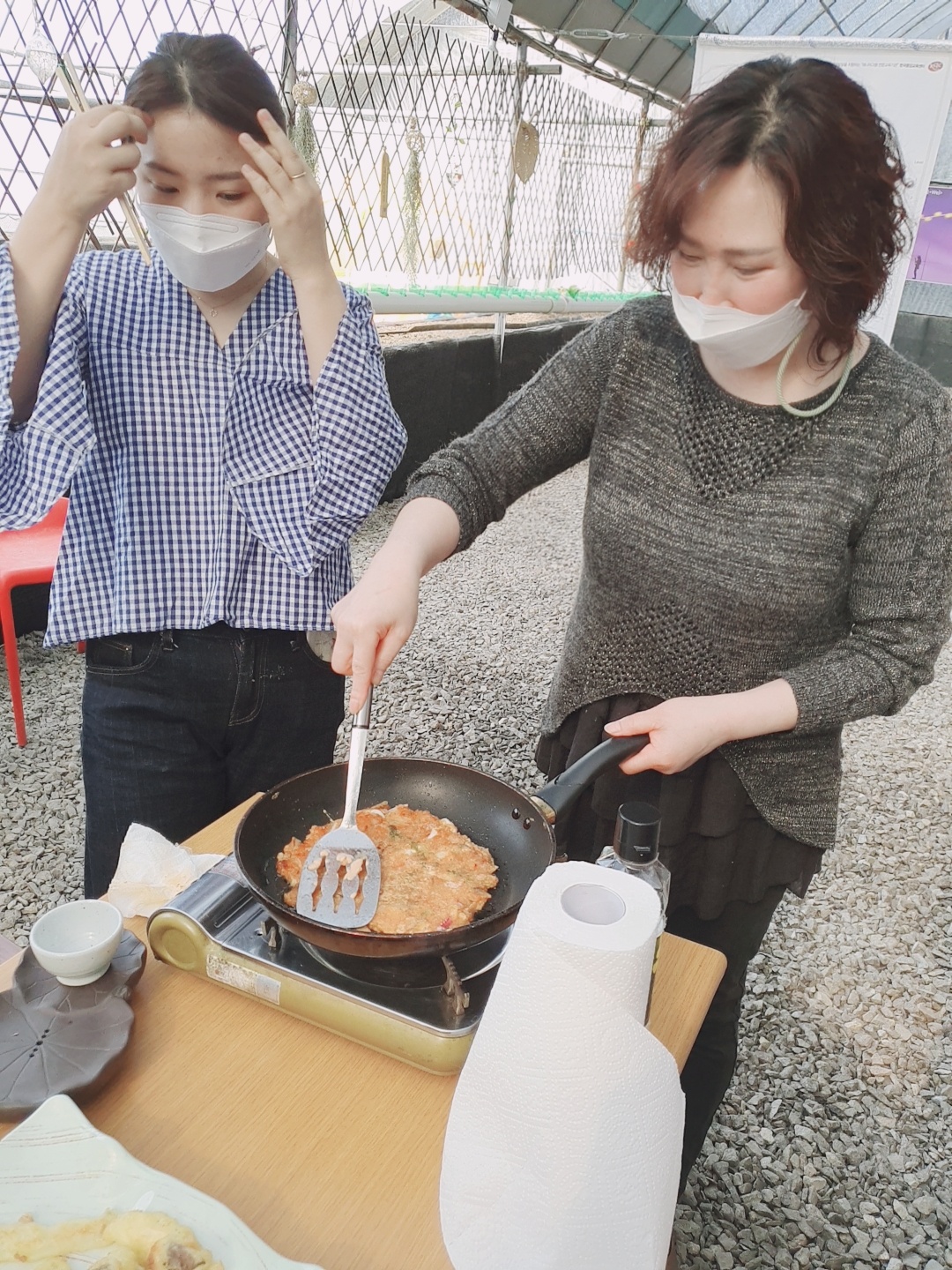 밭일을 하는 중에 사장님께서 고생하신다며 향기로운 꽃 차와 김치전, 버섯전을 준비해주셨습니다.