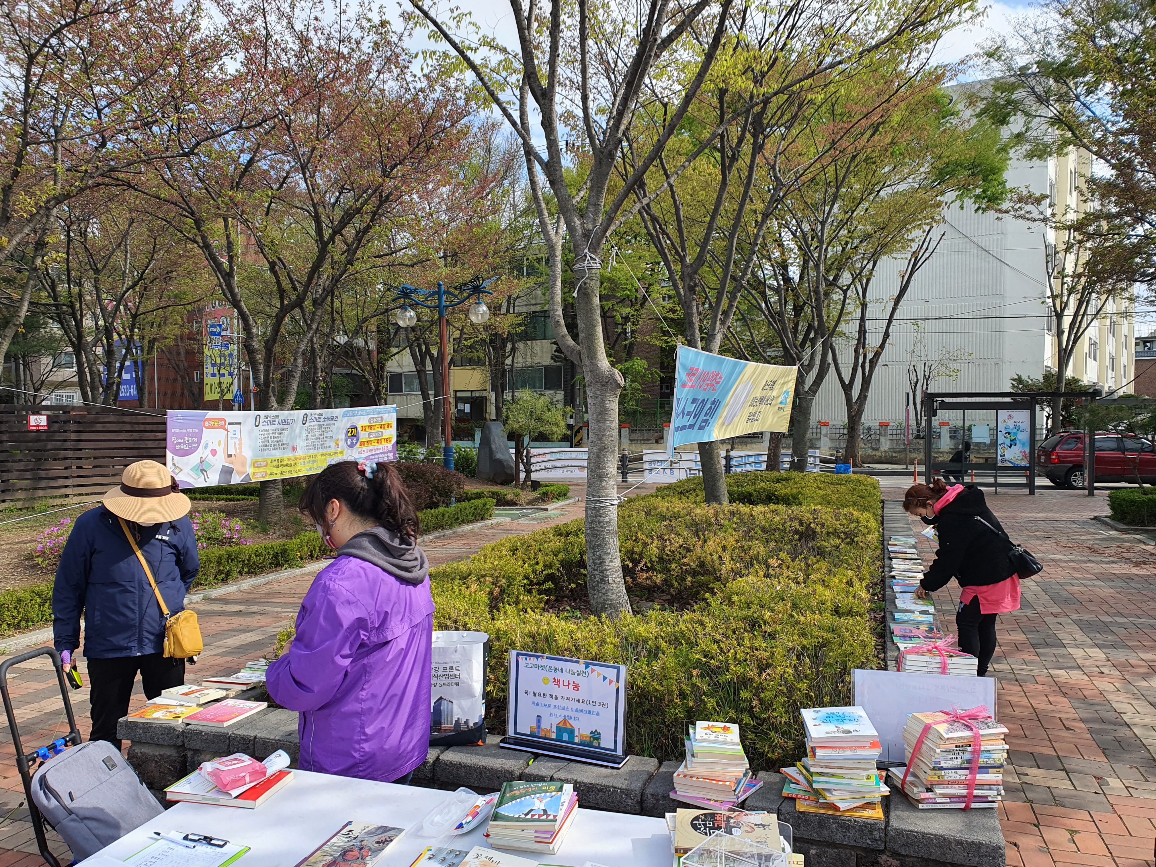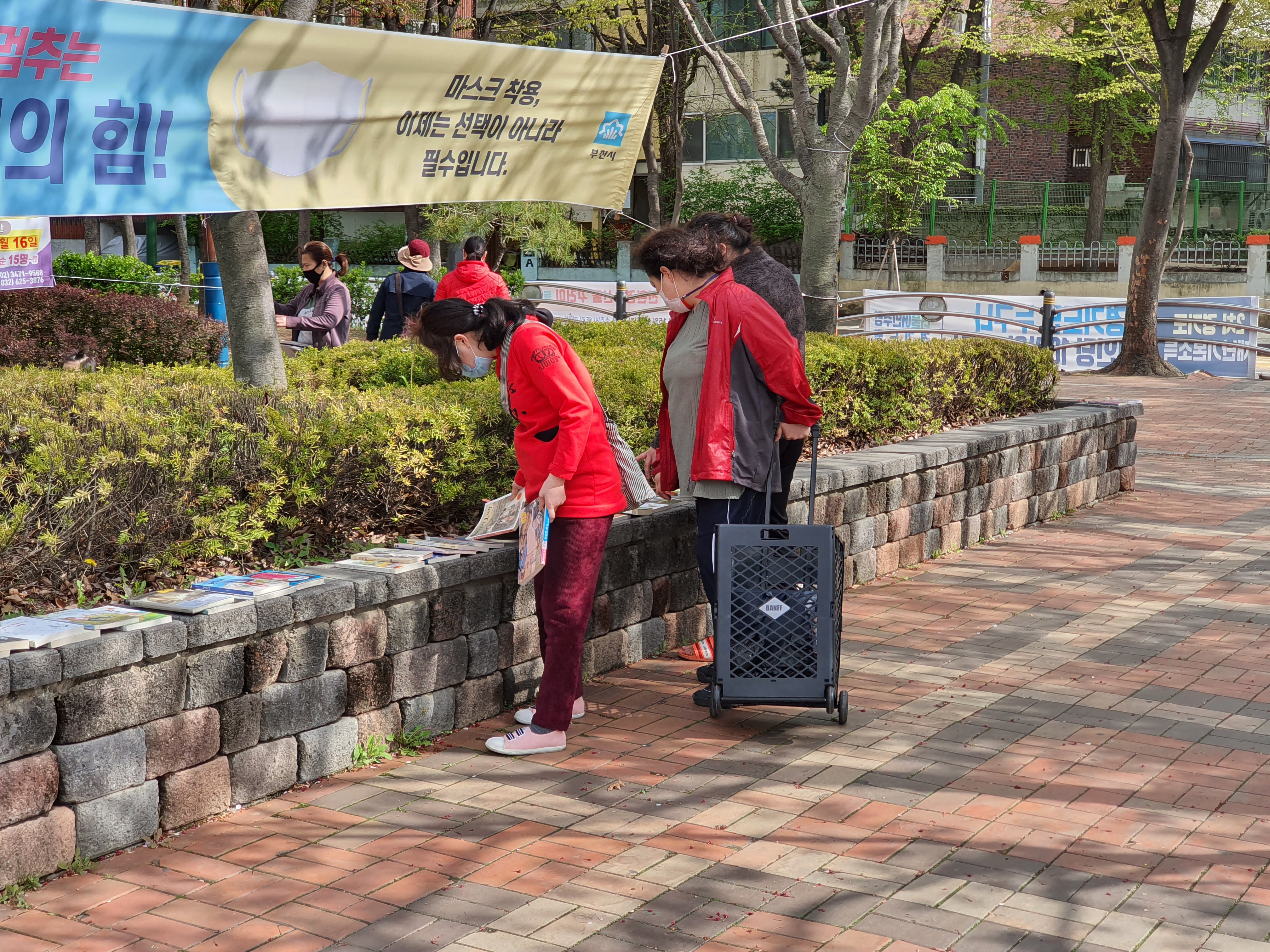 오늘은 서선희 과장과 함께 책을 들고 나왔습니다. 그간에 지역주민들이 기부해 주신 다양한 중고도서를 가지고 나와 수주공원을 찾은 주민들에게 나눔을 하였습니다.