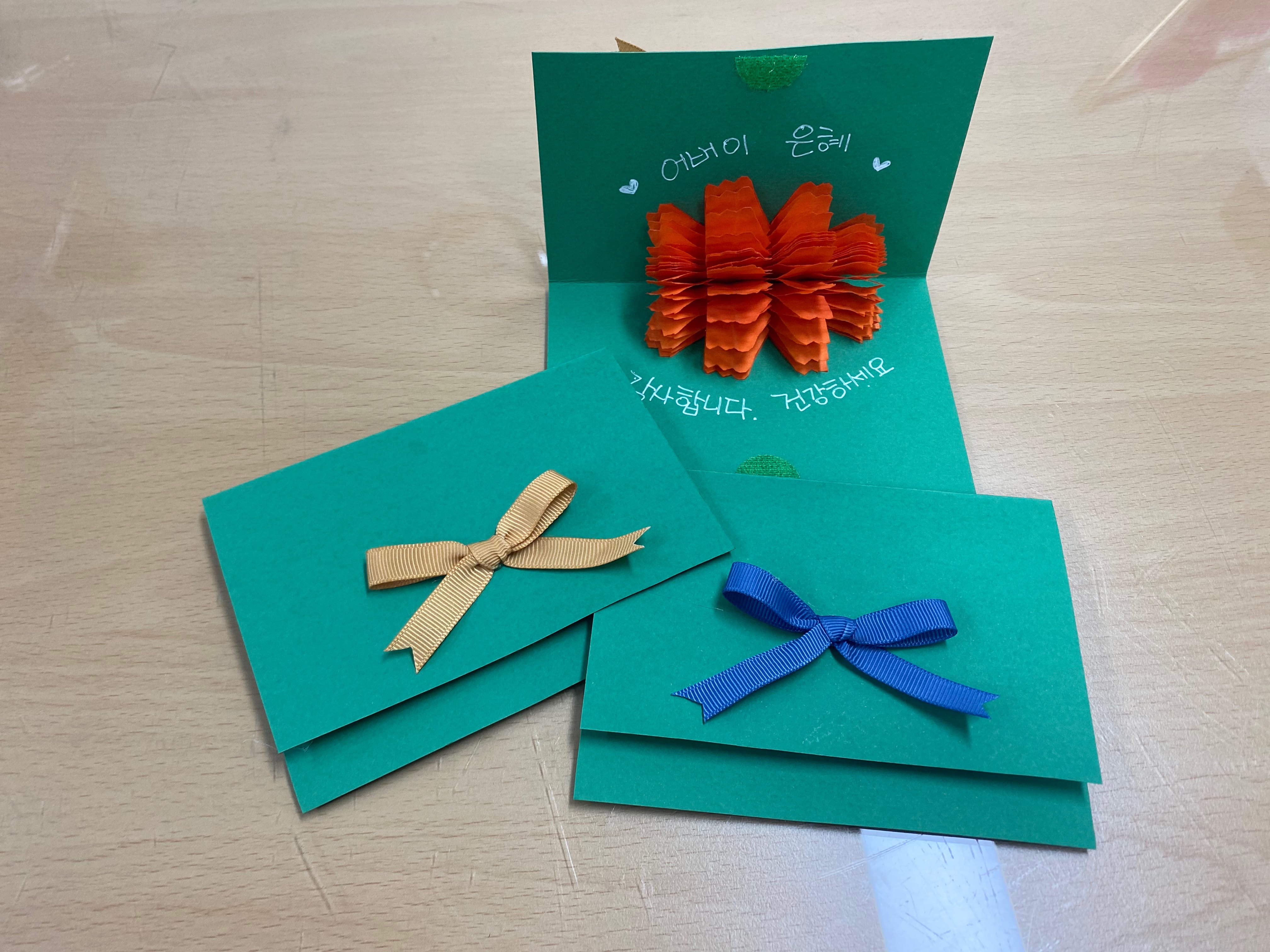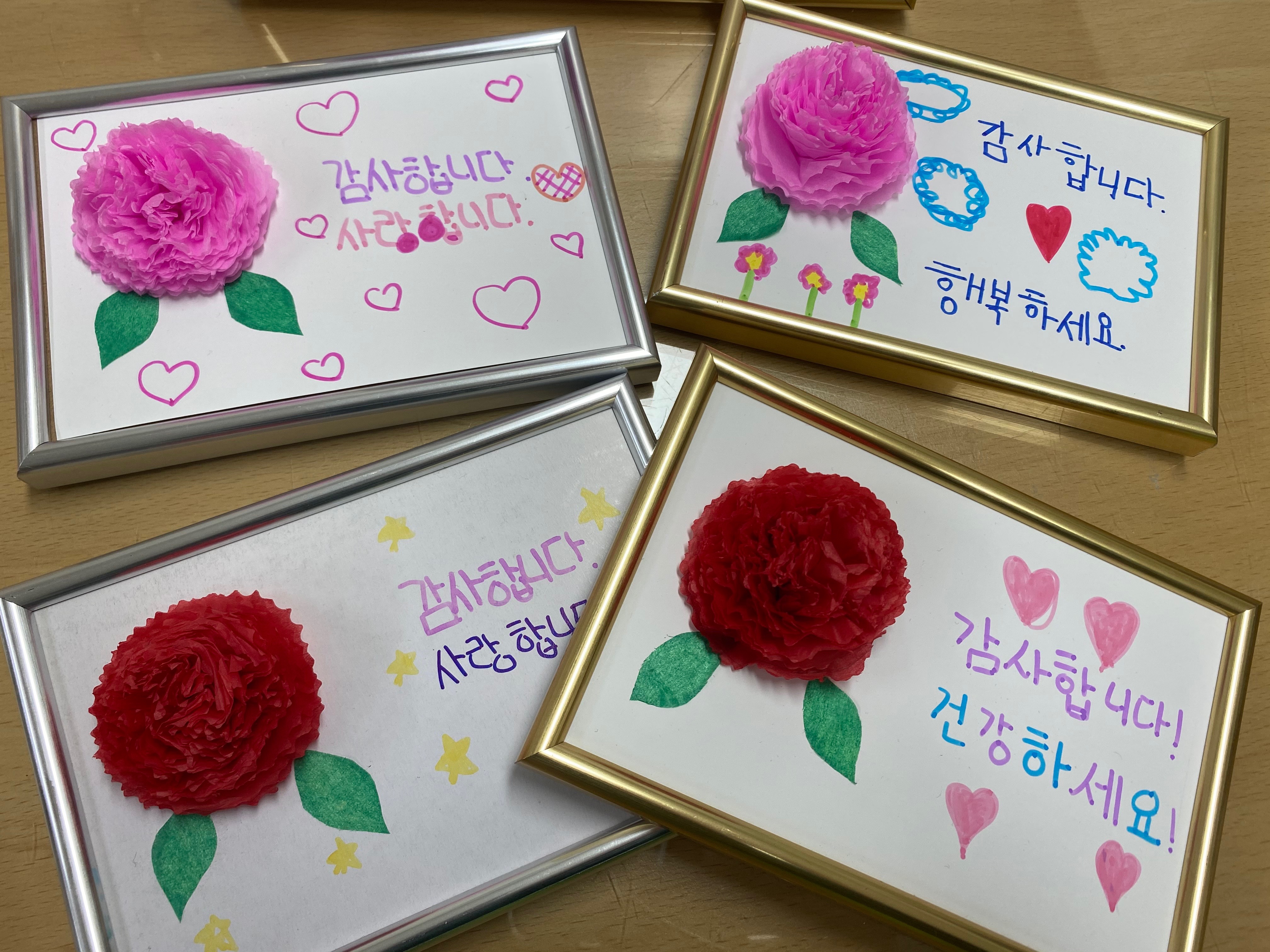 복지관 청수정(경로식당)에는 매일 240명의 어르신들이 오셔서 식사를 하시고, 거동이 불편하신 약 60분의 어르신은 반찬 배달 서비스를 이용하십니다. 어버이날, 지역에 계신 어르신들에게 감사한 마음을 전달하는 일에 아이들이 손수 만든 예쁜 카네이션이 더해지니 더욱 풍성한 어버이날이 될 것 같습니다.