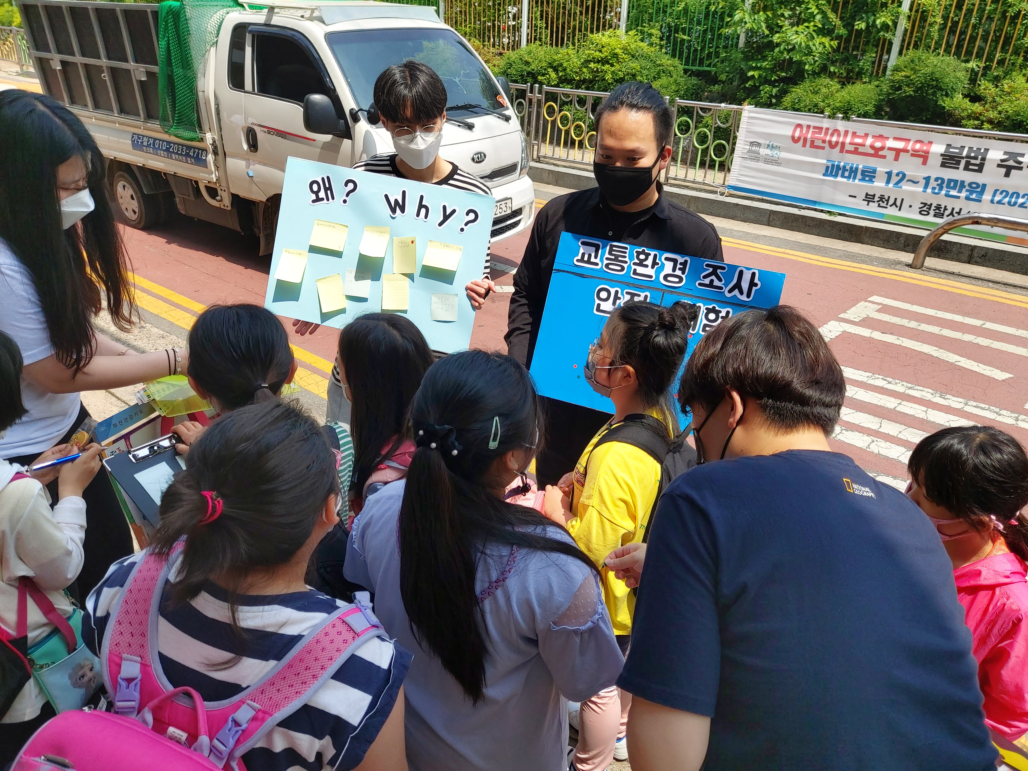 캠페인 당일! 고강초등학교 앞에서 ‘우리 마을의 교통환경은 안전한지 위험한지’