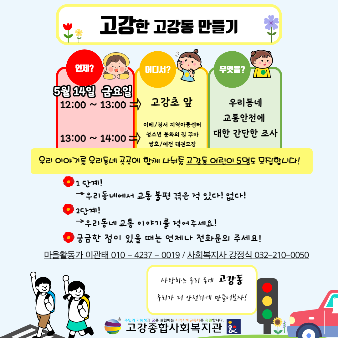 캠페인 당일! 고강초등학교 앞에서 ‘우리 마을의 교통환경은 안전한지 위험한지’