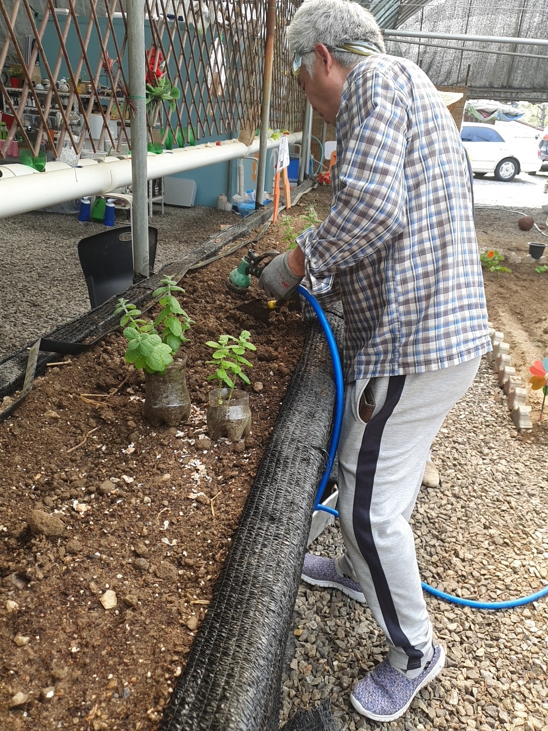 논의 끝에 스프링클러와 모종으로 키워 옮겨 심기로 했습니다.