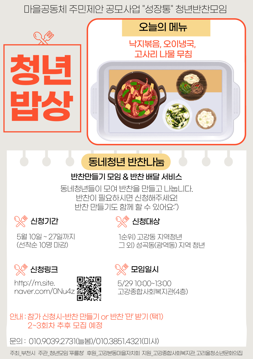 마을공동체 주민제안 공모사업 "성장통" 청년반찬모임 청년밥상 신청링크 입니다. 오정구 청년 누구나 함께 만들고 나누는 프로젝트 입니다. ● 신청 대상 : 1순위) 고강동(생활권자 or 활동가)