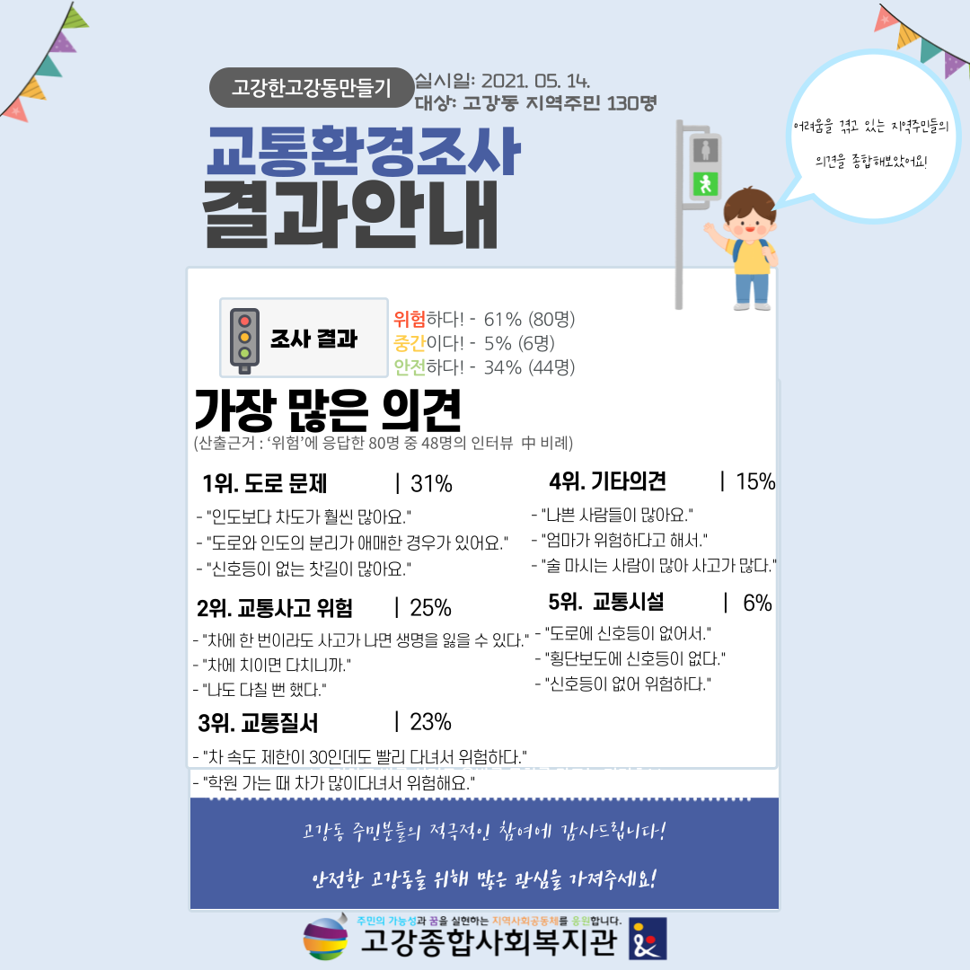 손종현: 생각보다 많은 고강동 친구들이 캠페인에 참여하였고 덕분에 교통환경조사를 안전하게 마칠 수 있었습니다. 캠페인을 통해 아이들의 순수한 시각으로 고강동을 바라볼 수 있었고, 어떤 점이 좋은지, 어떤 점이 불편한지 등의 의견을 수렴하면서 친구들의 욕구도 파악할 수 있어서 의미 있는 시간이었습니다.