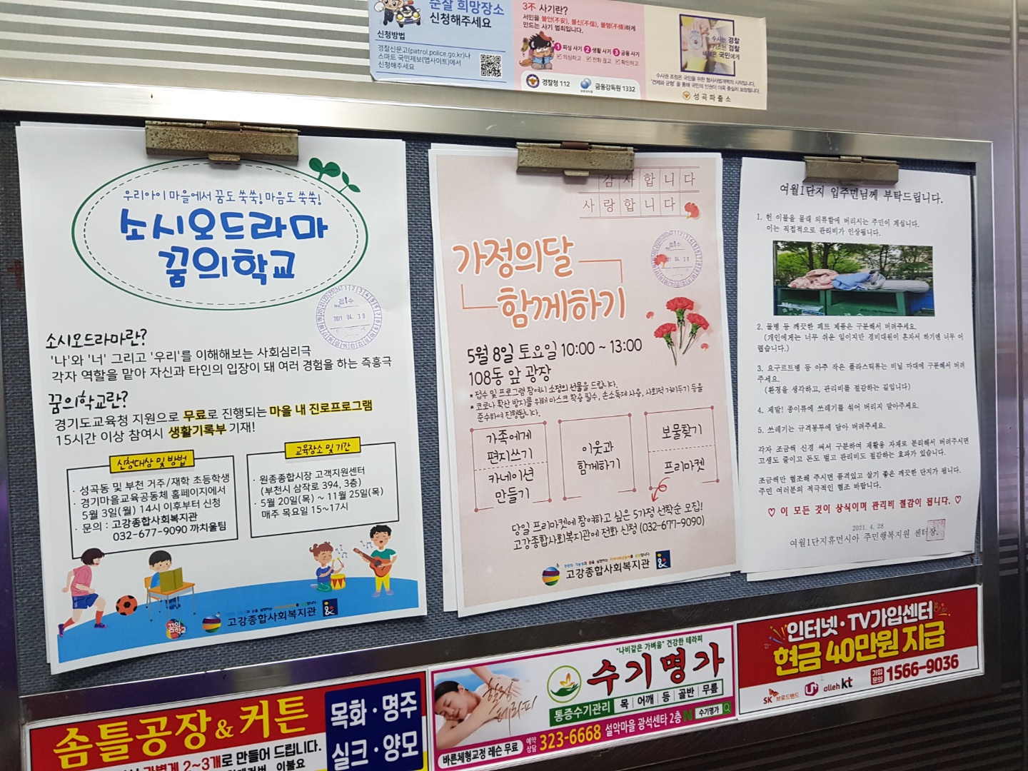1단지, 2단지 관리사무소에 방문하여 5월 행사를 알리고 각 동에 홍보를 부탁드렸습니다.