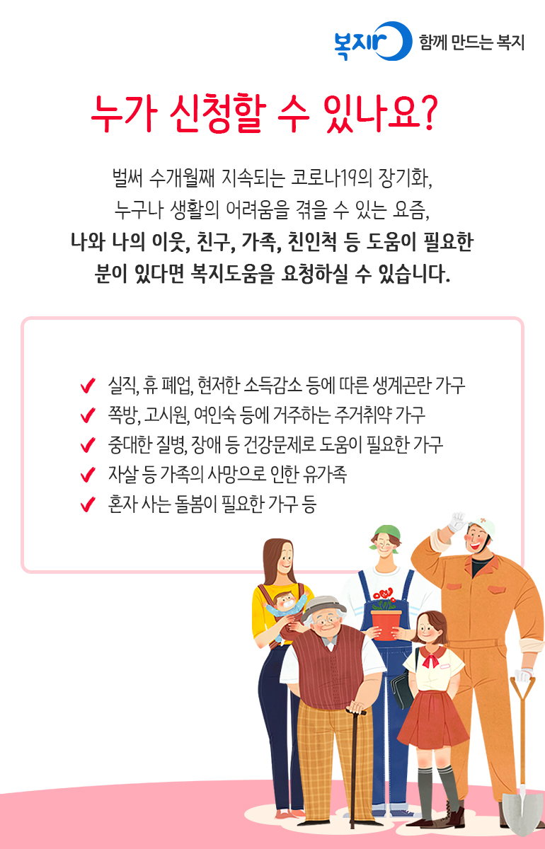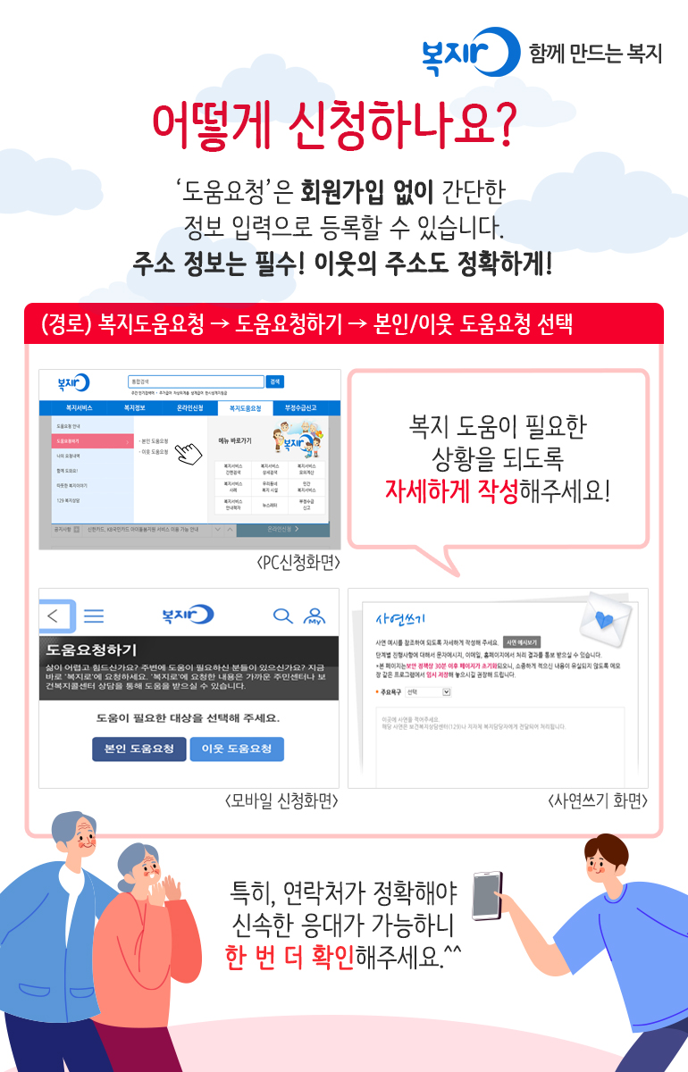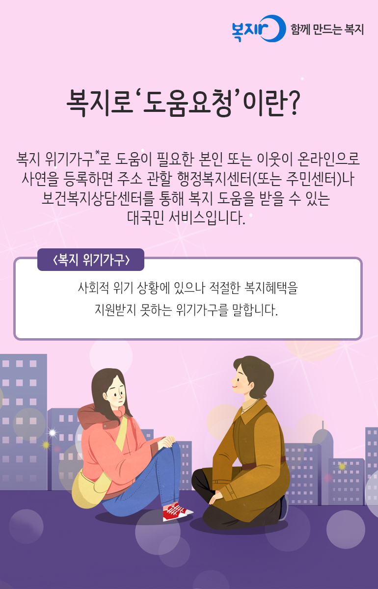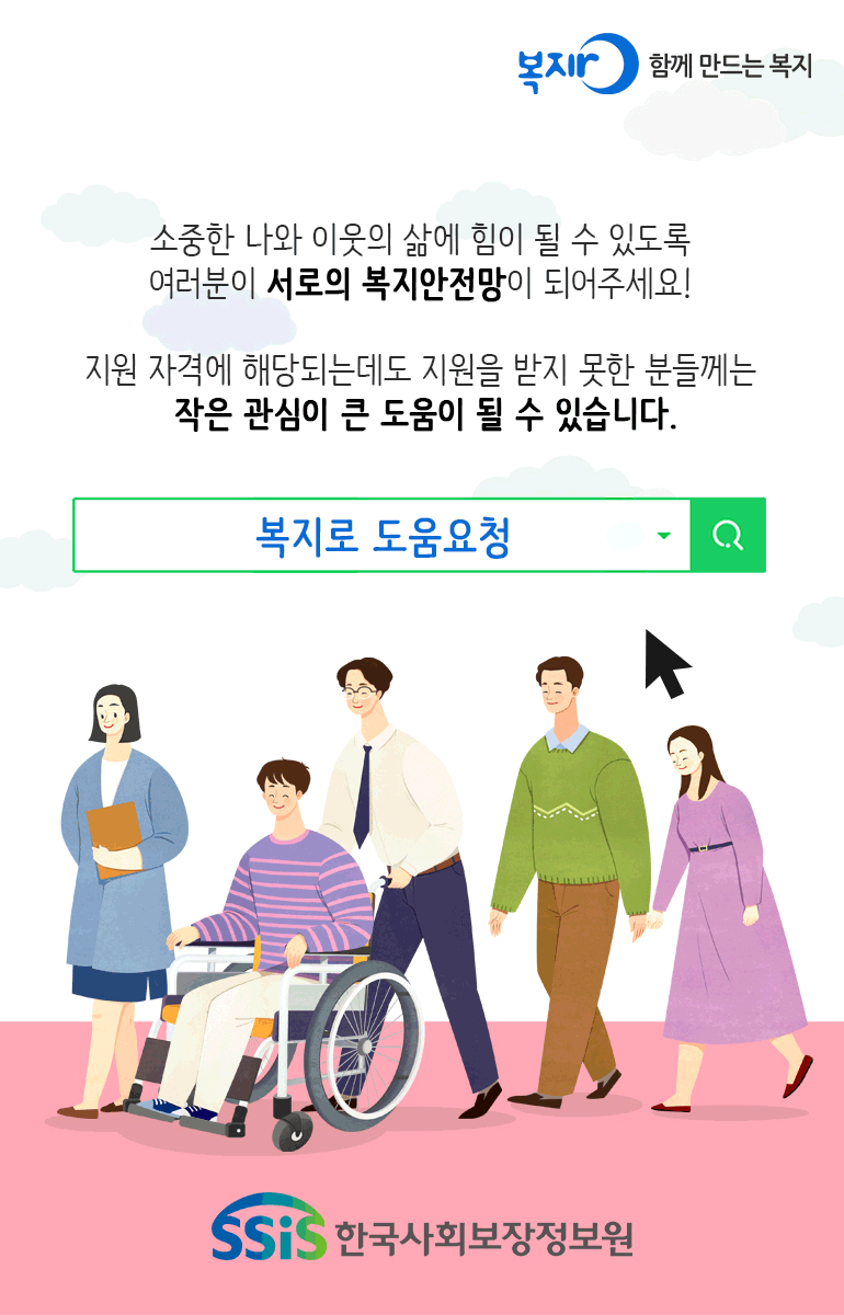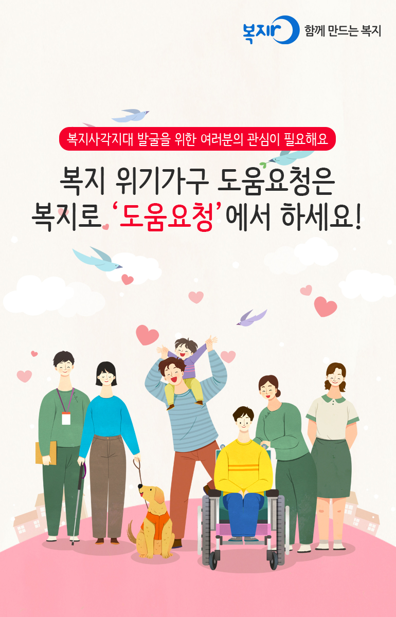 나와 나의 이웃, 친구, 가족, 친인척 등 도움이 필요한 분이 있다면 복지도움을 요청하실 수 있습니다.