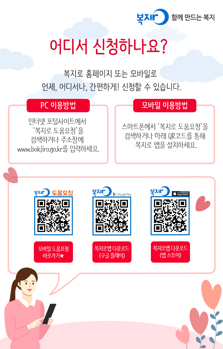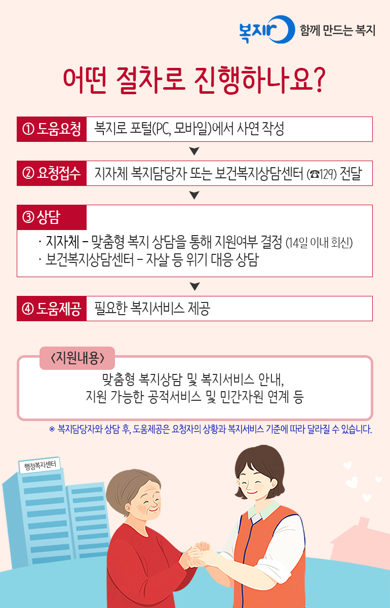 본인 도움요청 삶이 어렵고 힘들어 도움이 필요하시다면 언제든지 요청하세요. 가까운 주민센터와 보건복지상담센터 (129)를 통해 도움을 받으실 수 있습니다. ※ 요청 건은 14일 이내 처리됩니