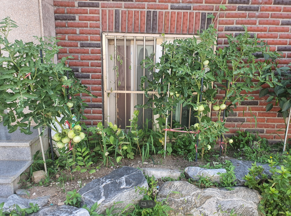 통장님네 텃밭은 토마토, 고추, 상추들이 무럭무럭 자라나고 있습니다.