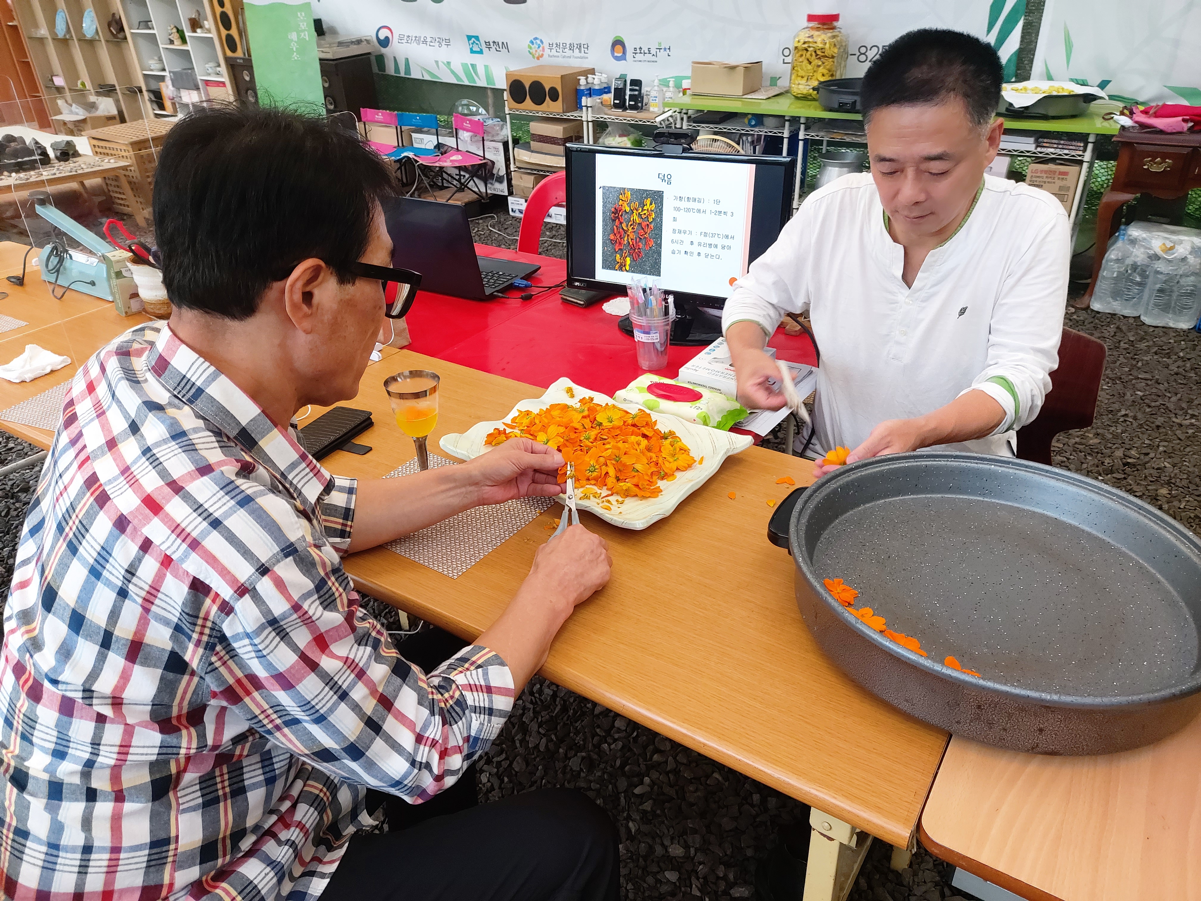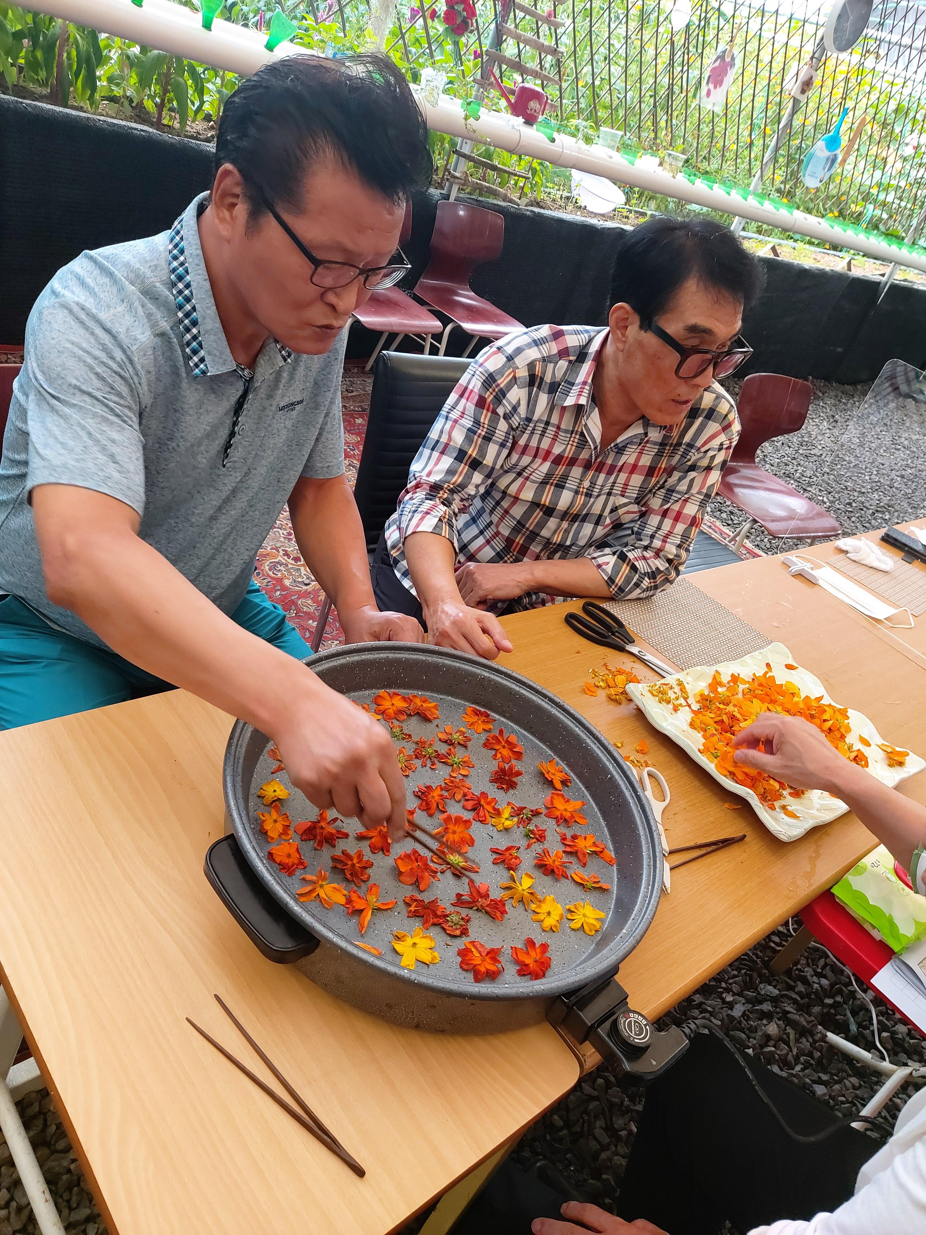 아뜰리에 온 김에 프로그램도 참여했습니다. 미리 따 놓으신 황화코스모스 꽃을 다듬고 덖을 준비를 했습니다. 꽃을 덖는다는 것 얘기만 들었지 실제로는 다들 처음으로 해보셨데요. 수제로 만들었다는 꽃차, 녹차 함부로 볼게 아니었어요. 1시간 가까이 덖고 식히고 덖고 식히고를 반복하니 힘들기도 하지만 집중하면서 하다보니 스트레스가 덖는만큼 사라지는 것 같습니다.