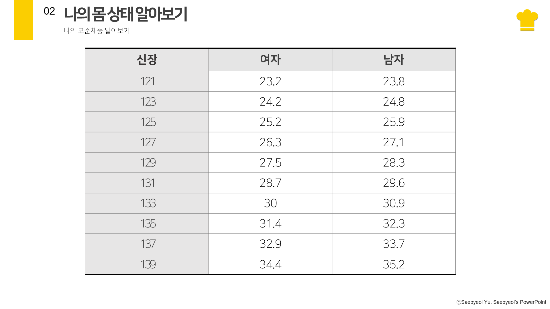 먼저, 나의 표준체중을 알아보는 방법에 대해 배웠어요.