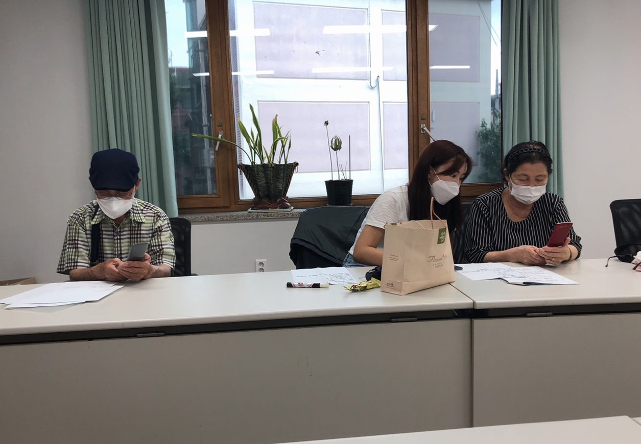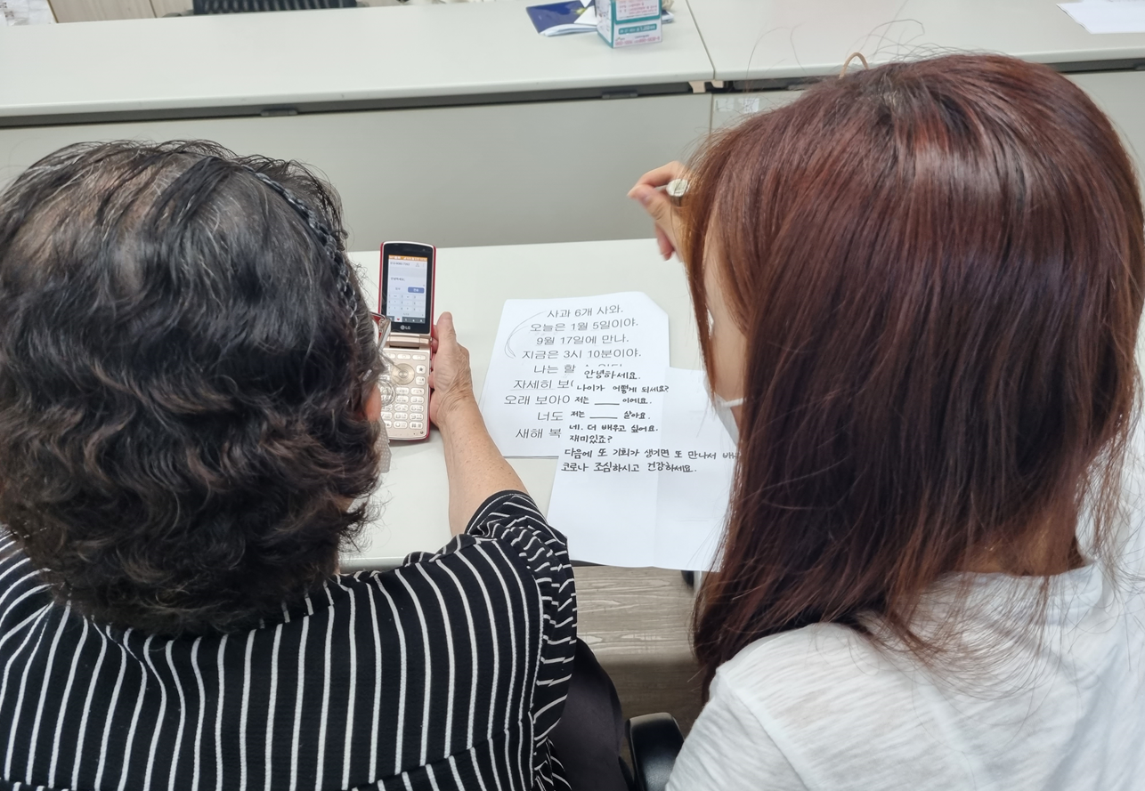 대본에 빈칸을 넣어 어르신들이 빈칸을 채우고 문자를 서로 주고받는 연습을 했습니다.