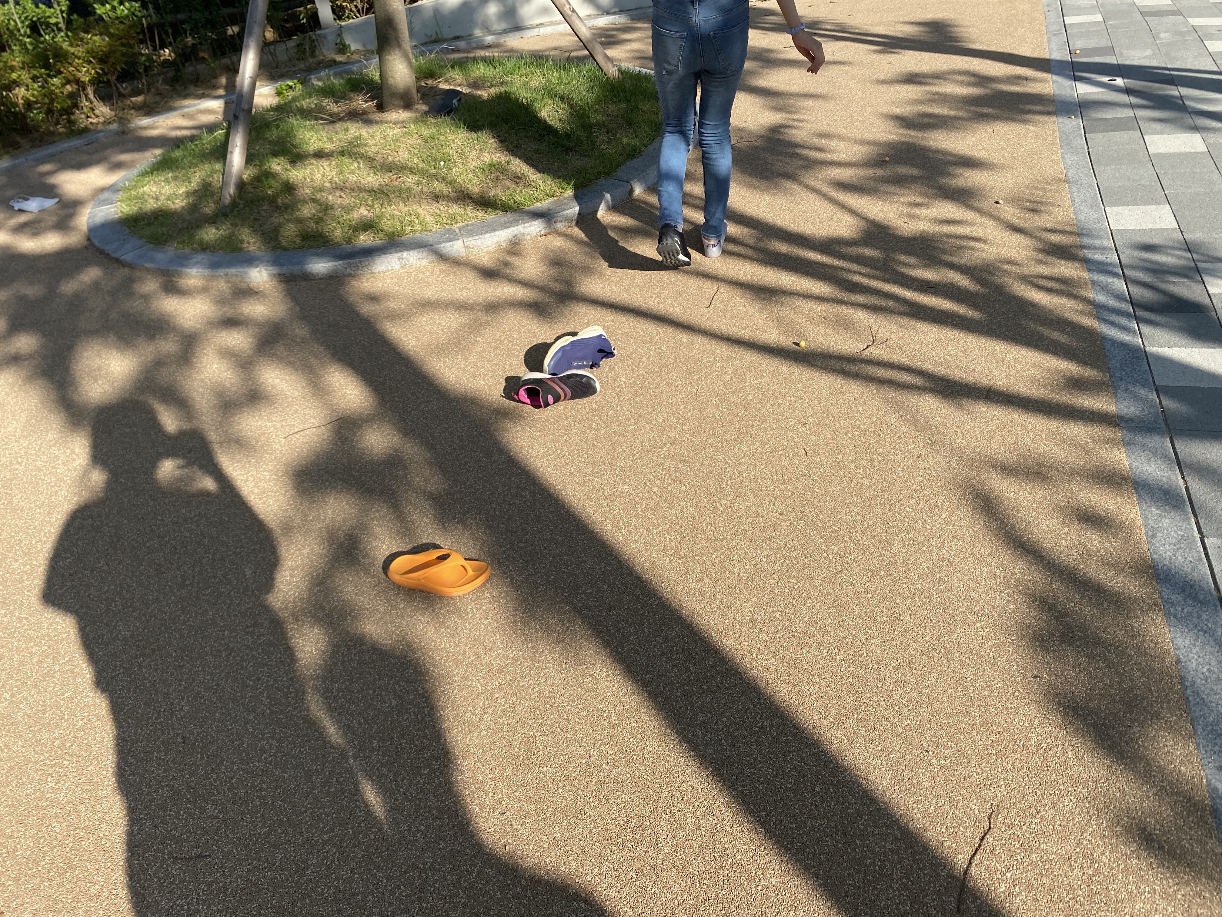 고무신에 관심 보이던 친구들이 신발 멀리 던지기를 했어요.